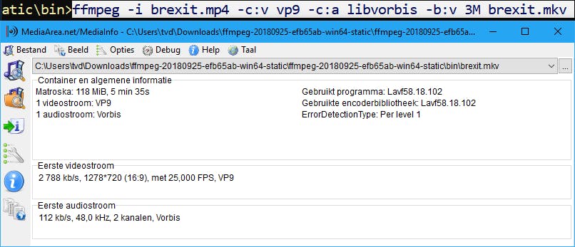 Wellicht de krachtigste tool voor multimediaconversies is echter FFMPEG, te vinden en beschikbaar voor Windows, macOS en Linux. In zijn eenvoudigste vorm kan zo’n commando er als volgt uitzien: ffmpeg -i invoer.mp4 uitvoer.webm. Let wel, een commando als ffmpeg -i invoer.mp4 uitvoer.mkv zou wellicht in een bestand met dezelfde codecs als invoer.mp4 resulteren, aangezien mkv-containers ontworpen zijn om met zowat elke videostroom overweg te kunnen.
