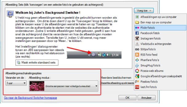 Geef aan hoe je Flickr-foto's als bureaubladachtergrond wil zien en wanneer John's Background Switcher de achtergrond moet verversen.