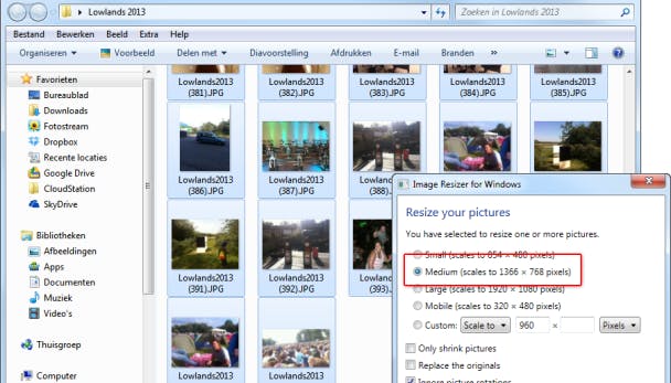 Met Image Resizer for Windows kun je meerdere afbeeldingen snel kleiner maken. Installeer het programma en maak een selectie foto's in de Windows Verkenner. Klik met de rechtermuisknop op de selectie en kies Resize pictures. Je hebt keuze uit meerdere formaten. Activeer bijvoorbeeld Medium om de afbeeldingen te verkleinen naar 1366 x 768 pixels. De verhoudingen blijven netjes intact. Belangrijk: indien de optie Replace originals is aangevinkt, overschrijft het programma de originele fotobestanden! Controleer altijd of deze instelling is uitgezet, dan maakt het programma kopieën en blijven originele fotobestanden intact.
