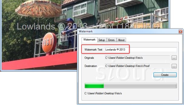 Siotra Watermark blinkt uit in eenvoud. Het programma heeft weinig opties, is zeer functioneel en doet precies wat het moet doen: een zelfgekozen tekst op jouw foto's plaatsen. De website van de makers was ten tijde van schrijven slecht bereikbaar. Gebruik Google om het programma binnen te halen of kijk bij een downloadarchief als Snap Files.
