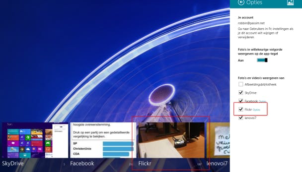 Een van de voordelen van Windows 8 is de integratie met sociale media, bijvoorbeeld met Facebook en Gmail. Ook kun je jouw Flickr-account koppelen aan Foto's, de standaard Windows 8-app voor jouw afbeeldingen. Dit dien je eenmalig in te stellen. Open de Windows 8-app Foto's en roep de Charms-balk op (Windowstoets+C). Ga naar Instellingen / Opties. Plaats een vinkje bij Flickr, klik op Opties en volg de wizard.