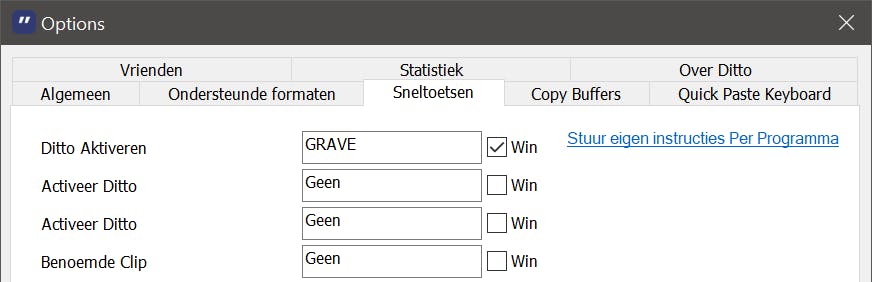 Nog even opgelet, want op het tabblad Sneltoetsen wordt onder meer ingesteld welke toets het plakscherm van Ditto Clipboard Manager tevoorschijn laat komen. Met de Windowstoets+~ doen we misschien een handig voorstel.