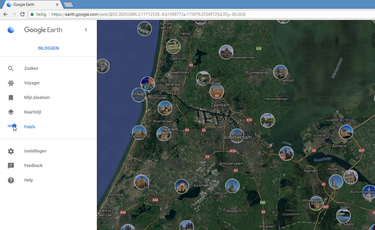 Wat de 'gewone' Google Earth - daarover straks meer - aardig maakte was de inschakelbare fotolaag. Iets soortgelijks kan ook in de browserversie. Klik weer op de knop met de drie streepjes in de knoppenbalk links en zet de schuifregelaar bij Foto's op aan. Het resultaat van deze actie is direct zichtbaar. Klik op een foto om deze vergroot zichtbaar te maken; om weer terug te keren naar de kaart klik je op het naar links gerichte pijltje links bovenaan een foto. Verder is ook in de cloudversie van Google Earth het onderdeel Voyager te vinden. Met dit onderdeel krijg je een virtuele rondleiding rondom een bepaald thema, de moeite van het uitproberen waard.