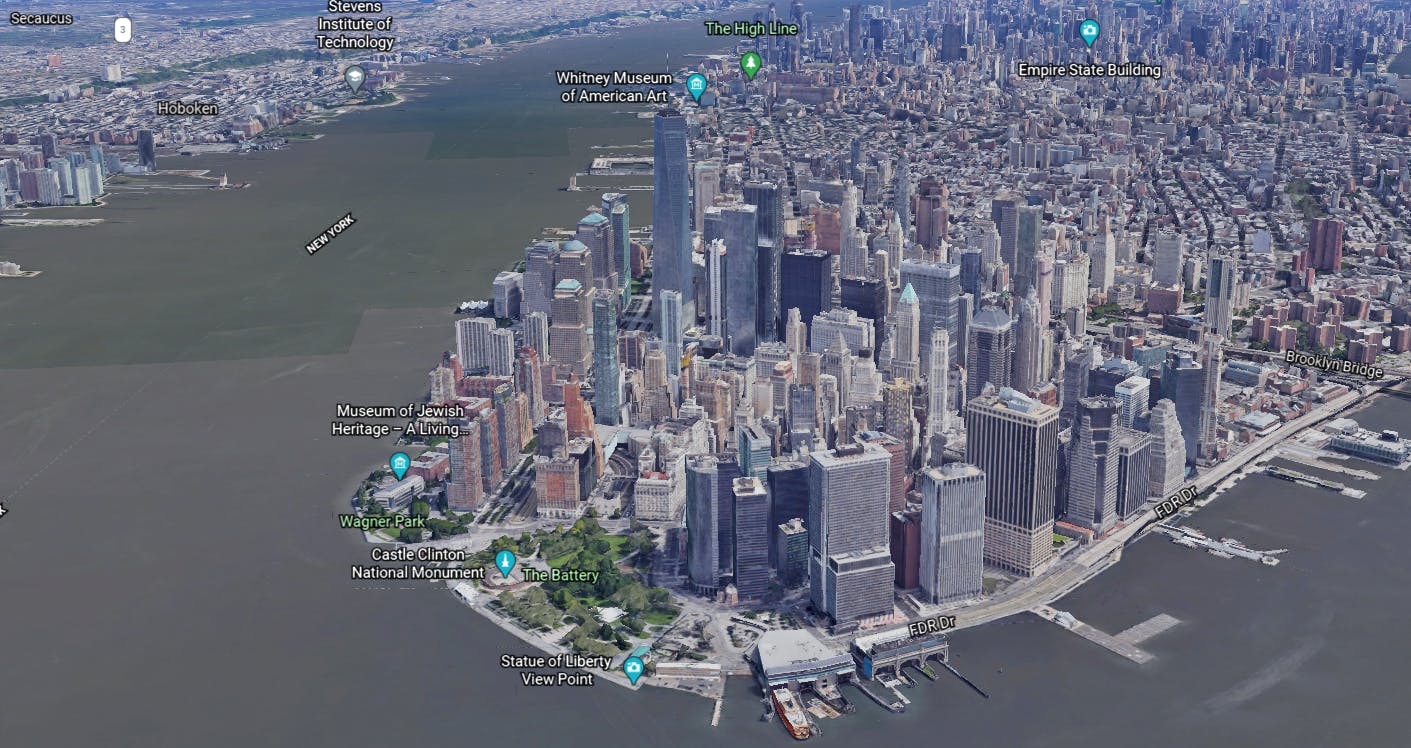 Op de geopende pagina klik je op deze vereisten om te zien of je in staat bent om 3D-modellen te laten weergeven. Als je aan de eisen voldoet, kun je op de knop Maps met 3D gebruiken klikken. Het beste gebruik je hiervoor trouwens Googles eigen browser Chrome. Je ziet nu linksonder de optie Earth, klik erop en je ziet een satellietweergave van je kaart. Rechts onderin is nu een extra knop verschenen met vier vlakjes. Selecteer deze optie om de weergave te kantelen. Klik er nog een keer op en je ziet de kaart vanuit vogelperspectief. Als je naar een stad met 3D-beelden navigeert, bijvoorbeeld New York, en je inzoomt op het centrum, verschijnen er 3D-beelden van gebouwen in de stad.