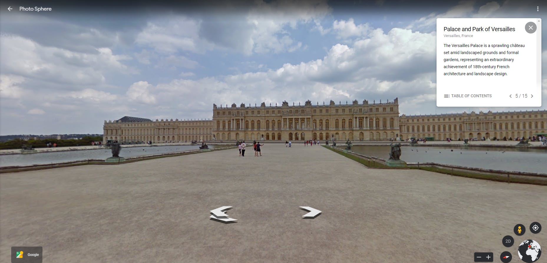 Een vergelijkbaar systeem heeft Google toegepast bij verschillende bekende bouwwerken, zo kun je met de technologie van Street View binnen de muren van paleizen, kerken en kastelen kijken. Klik hier op Alles verkennen. Kies voor Locaties en selecteer een werelddeel aan de rechterkant of zoom in op een land. Klik op een blauwe stip en op de volgende pagina lees je wat er allemaal van de bezienswaardigheid is te bekijken. Onder Street View zie je welke dingen je interactief kunt bezichtigen. Mochten er meer dan twee opties zijn, klik dan op Alle weergeven om alle opties te zien. Klik op een foto en aan de linkerkant verschijnt een plattegrond.