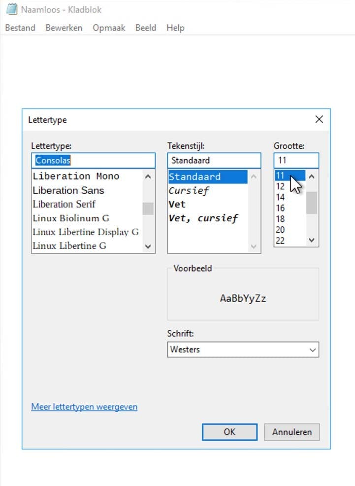Wil je het lettertype wijzigen, dan is het zaak om voor een 'mono spaced' exemplaar te kiezen. Ofwel: een lettertype waarbij de afstand tussen de letters precies even groot is. Een populair lettertype als bijvoorbeeld Arial is niet mono spaced, wat betekent dat bijvoorbeeld een 'i' minder ruimte inneemt als een 'w'. Dat ziet er heel mooi uit, maar veel tekstbestanden zijn met spaties en tabs uitgelijnd. Dat trucje werkt alleen bij mono spaced lettertypen, in andere gevallen klopt er niets meer van de uitlijning! Goed controleren dus of jouw beoogde lettertype het goede is. De andere lettertypen werken ook gewoon, maar geven opmaakproblemen als je eens een standaard readme-bestandje of iets dergelijks opent.
