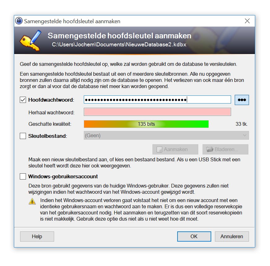 Nu is het nodig een KeePass-database aan te maken. Dat is een versleuteld bestand waarin je wachtwoorden staan. Het is belangrijk dat je dit bestand beschermt met een zelfgekozen, sterk, niet eerder gebruikt wachtwoord. Klik op Bestand, Nieuw en kies een locatie om de database in op te slaan. Handig is bijvoorbeeld OneDrive of Dropbox. Het bestand is toch versleuteld, dus niemand kan erbij, en zo kun je dezelfde database op andere pc's gebruiken. Klik op Opslaan als je de juiste map hebt gekozen. Vervolgens vul je een hoofdwachtwoord in, twee keer. Probeer de balk eronder groen te krijgen: pas dan heb je een sterk wachtwoord. Vooral lengte is van belang, een wachtzin is dus aan te raden en bovendien makkelijker te onthouden. Klik op OK en klik ook bij het nu geopende venster Database-instellingen op OK.