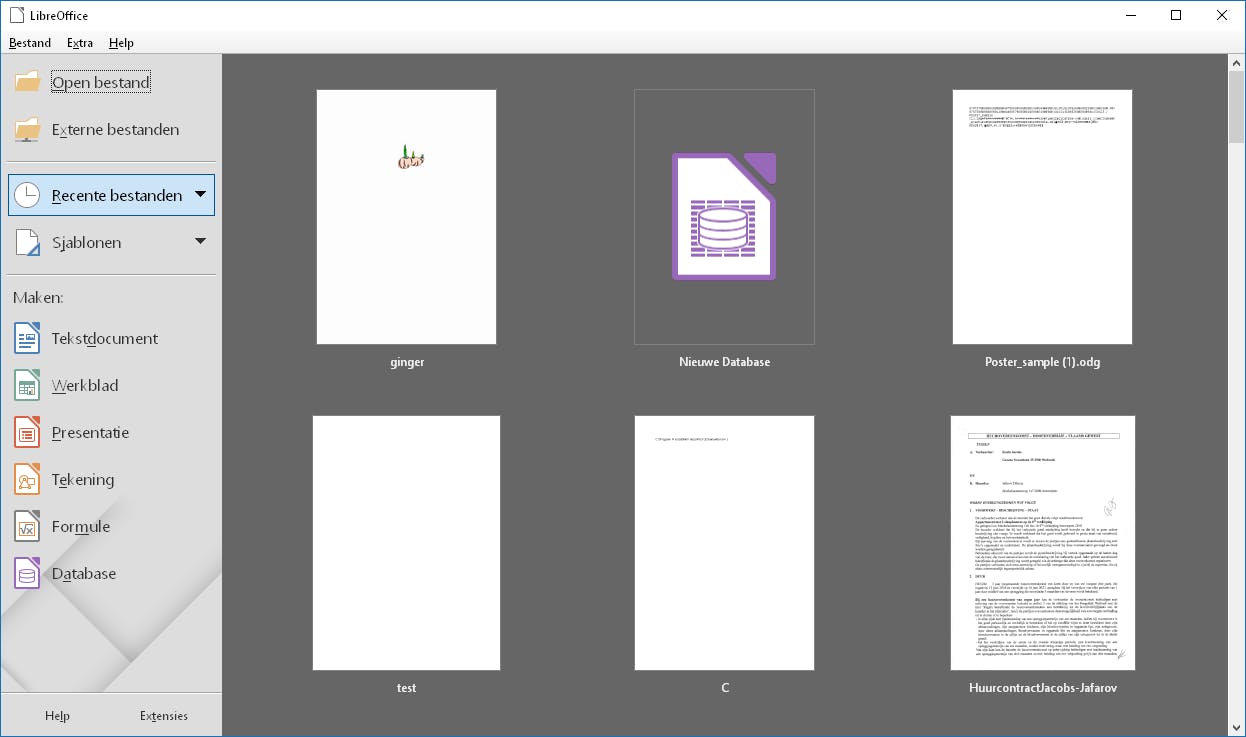 LibreOffice opent razendsnel. Je komt in een venster met aan de linkerkant een menu om de toepassing te selecteren die je wilt starten. Aan de rechterkant herken je snelkoppelingen naar documenten die je recent hebt opgeslagen. De eerste keer dat je deze suite opent, is dit veld dus leeg. Er is ook een knop Sjablonen, die je bij een aantal templates brengt voor iedere applicatie. Het moet gezegd: het aanbod sjablonen is beperkt. Je kunt via de functie Sjabloonbeheer wel nog nieuwe modellen van internet importeren.