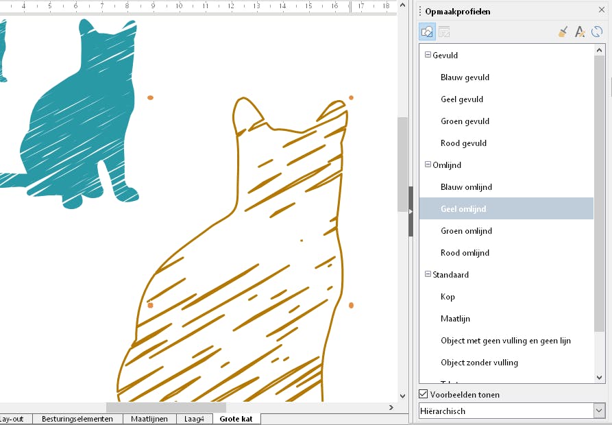 De zijbalk in Draw heeft vier panelen, waarvan maar één paneel tegelijk geopend kan zijn. Ook hier is het eerste paneel de Eigenschappen, waarmee je de positie, het lettertype en de schaduwen instelt. In het paneel Galerij zit een collectie objecten, vormen, pijlen, 3D-objecten en elementen stroomdiagrammen te maken. Net zoals je tekststijlen kunt vastleggen, is het in Draw mogelijk om afbeeldingsstijlen op objecten toe te passen via de sectie Opmaakprofielen. Op die manier kun je het uiterlijk van alle elementen die zijn opgemaakt met een bepaald profiel, tegelijk wijzigen door hun opmaakprofiel aan te passen. Ten slotte zit in de zijbalk ook de Navigator, waarmee je snel tussen de pagina’s in de tekening navigeert. Standaard slaat Draw de afbeeldingen op in het open document formaat .odg, maar je kunt via de functie Exporteren het project ook wegschrijven naar de bitmap-formaten .bmp, .gif, .jpg, .png, .tiff en naar de vectorformaten .eps, .svg.