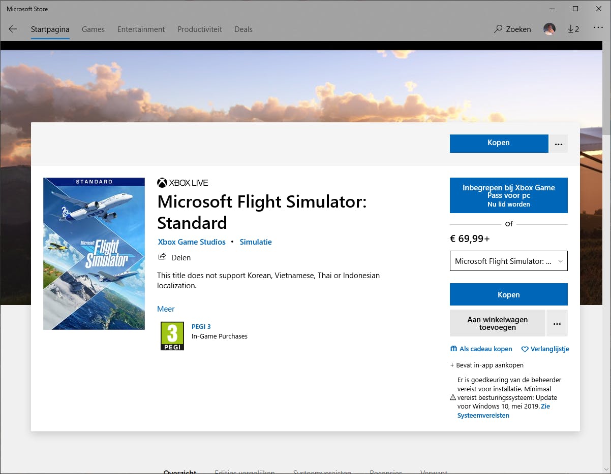 Flight Simulator zal voor velen de eerste aankoop in de Microsoft Store zijn. Klik op Start / Microsoft Store / Zoeken en typ Flight. Wacht tot het programma wordt gevonden en selecteer de gewenste versie. Klik op Kopen / Installeren en kies waar je de sim wilt installeren. Selecteer de snelste opslag die er in de pc aanwezig is. Klik opnieuw op Installeren en wacht tot de eerste 1 GB is gedownload en Flight Simulator start. Voor contact met Air Traffic Control (de luchtverkeersleiding) moet de Engelse taal aan Windows worden toegevoegd. Klik op Start / Instellingen / Tijd en Taal / Taal / Een taal toevoegen. Selecteer English (United States) / Volgende / Installeren. Schakel terug naar Flight Simulator om de bijna 100 GB van de offline-wereld te downloaden. De snelste ssd is opnieuw de juiste keuze. Klik op Update en ga koffiedrinken of avondeten, anderhalf uur is geen uitzondering. Is de download klaar, klik dan op Continue om Flight Simulator echt op te starten.