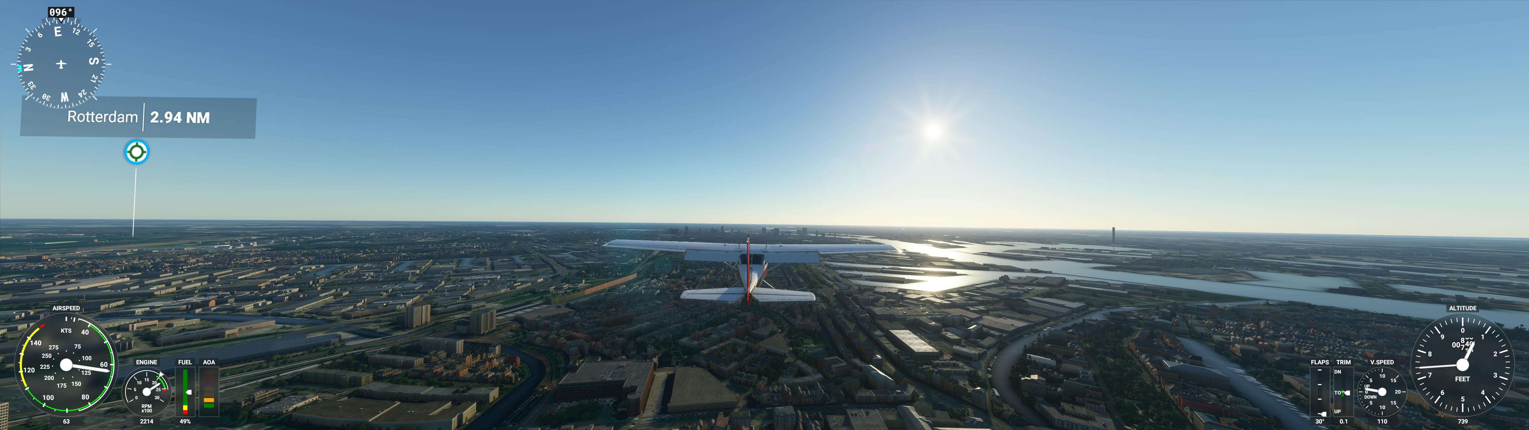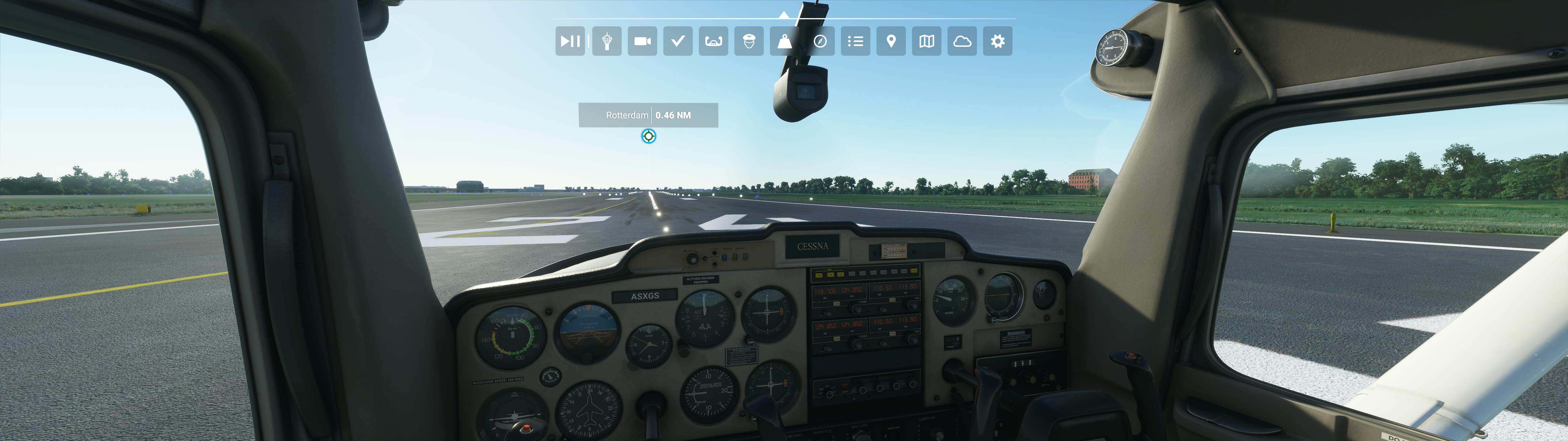 Tijd om achter de stuurknuppel te kruipen. Klik op Home en kies World Map. Klik op het vliegtuig linksboven en kies Propellers / Textron Aviation Cessna 152. Klik dan op Select Departure Airport en selecteer EHRD Rotterdam Airport. Klik op de landkaart op Rotterdam Airport en kies Set as arrival. Klik nu op Flight Conditions en zet Multiplayer en Air Traffic op Off en Weather & Time op Custom. Selecteer Clear Skies en selecteer met de schuif eronder een moment midden op de dag. Klik dan op Close / Fly / Ready to Fly. Je staat nu op de startbaan van Rotterdam Airport, zittend in de cockpit van een Cessna 152. Met de rechtermuisknop ingedrukt kun je rondkijken, met het scrollwiel op de muis in- en uitzoomen. Voor je zie je het instrumentenpaneel en de yokes, de twee vliegsturen. Klik je op een yoke dan verdwijnt die, zodat je de knoppen en meters erachter kunt zien. Klik nog een keer en de yoke is weer terug. Handels, zoals de zwarte Throttle control en de rode Mixture Control, kun je met de muis pakken en in- en uitschuiven. Druk de Throttle Control naar voren en je hoort de motor brullen en de propeller op toeren komen. Helemaal boven in het midden van het beeld zie je een kleine witte driehoek; hiermee open en sluit je het zwevende menu dat toegang geeft tot een groot aantal handige opties.