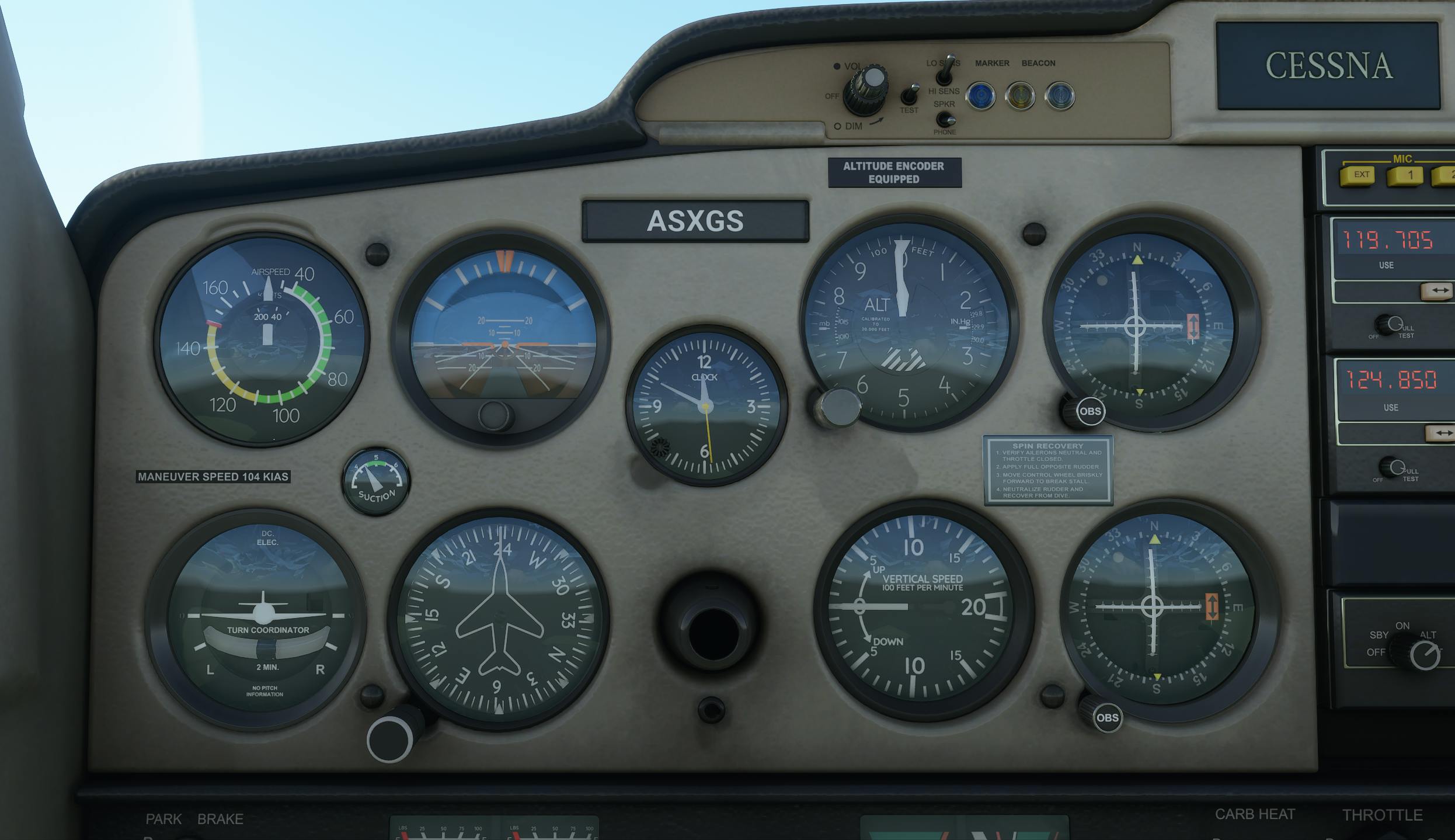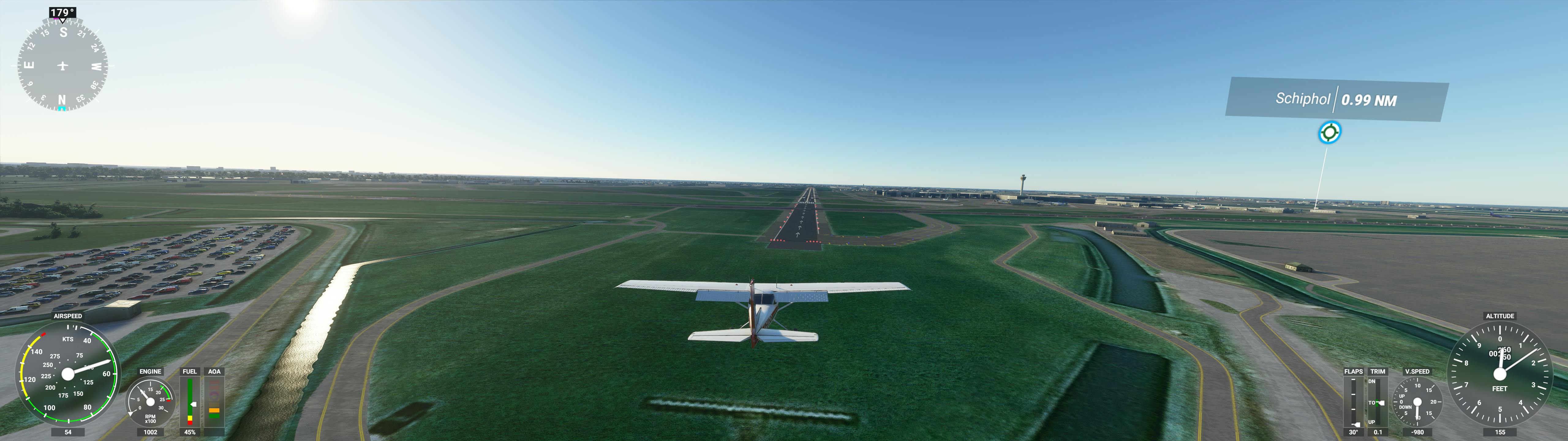 Met Control + 1 breng je de belangrijkste instrumenten in beeld. Linksboven is dat allereerst de Airspeed-indicator. Deze geeft de snelheid in de lucht aan. De meeteenheid is knots of knopen. Eén knot is 1,85 kilometer en met een Cessna als deze ga je airborn met ongeveer 55 knopen. Rechts ernaast zit de Attitude-indicator of kunstmatige horizon. Deze toont de houding van het vliegtuig gerelateerd aan de aarde. Rechts daarnaast zit de Altimeter of hoogtemeter. Belangrijk, de kleine wijzer geeft de duizendtallen aan, de grote wijzer de honderdtallen. De grote wijzer draait dus sneller dan de kleine. Onder de hoogtemeter zit de Vertical Speed indicator. Deze laat zien of het vliegtuig stijgt of daalt. Links ervan zit het kompas. De neus van het vliegtuig is duidelijk zichtbaar en tijdens het vliegen zal het kompas meedraaien. De graden staan duidelijk aangegeven, maar wel allemaal zonder een nul. Dus 3 is 30 graden en 15 is 150. Tot slot linksonder de Turn-indicator. Deze toont de rotatie van het vliegtuig langs de lang-as, de denkbeeldige as die van staart tot neus door het vliegtuig loopt. Draait het vliegtuig, dan komt één vleugel omhoog en gaat de andere omlaag. Bij een gecoördineerde bocht combineert het vliegtuig de beweging langs de lang-as (dit wordt rollen genoemd) met gieren, een draaibeweging rond het middelpunt van het vliegtuig. Gieren is het best te vergelijken met het van richting veranderen van een auto. Met Control + Spatiebalk kijk je weer recht uit de cockpit naar voren.