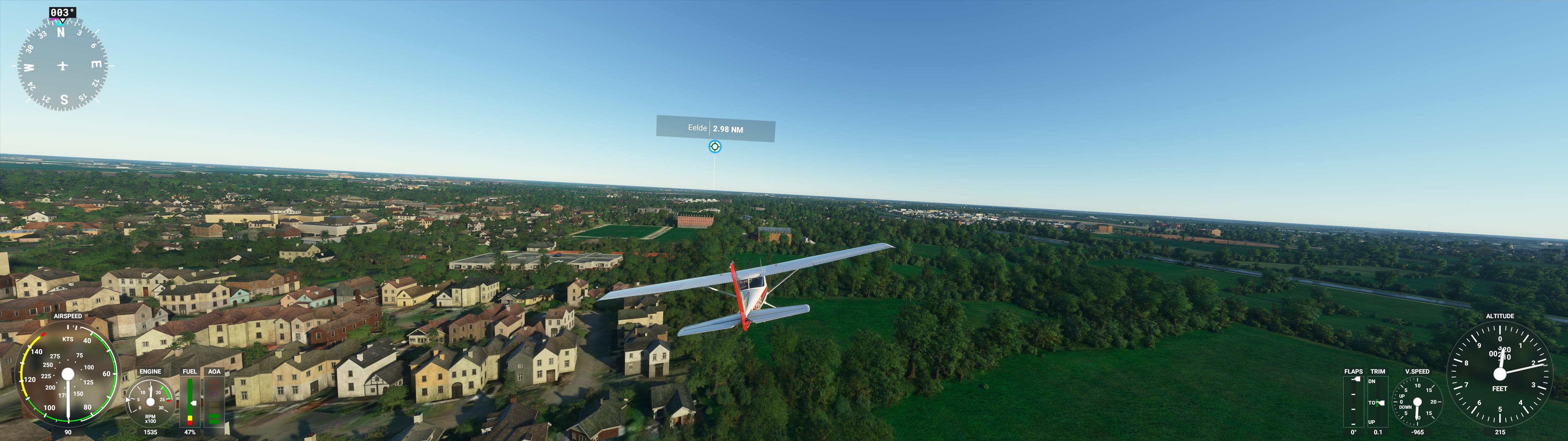 Door het gebruik van Bing Maps klopt het wegenpatroon in Flight Simulator zeer goed, net als de loop van rivieren. Ook staan er op de juiste plek huizen en schuren. Dit maakt het mogelijk volledig op zicht te navigeren en bijvoorbeeld over je eigen huis te vliegen. Klik op Home / World Map en selecteer opnieuw de Textron Aviation Cessna 152. Kies als vertrekpunt het vliegveld dat het dichtst bij je huis ligt. Kies opnieuw voor Clear Skies en een moment midden op de dag. Klik op Close / Fly / Ready to Fly en breng de Cessna weer stabiel in de lucht op 1000 foot. Schakel nu over naar de drone camera zodat je maximaal kunt oriënteren op alles wat er op de grond te zien is, en stuur het vliegtuig via wegen, dorpen, rivieren of welk herkenningspunt je ook maar hebt, naar jouw stad of dorp. Huizen staan op de goede plek en voetbalvelden en tennisbanen zijn herkenbaar; je huis is dan ook snel te vinden.