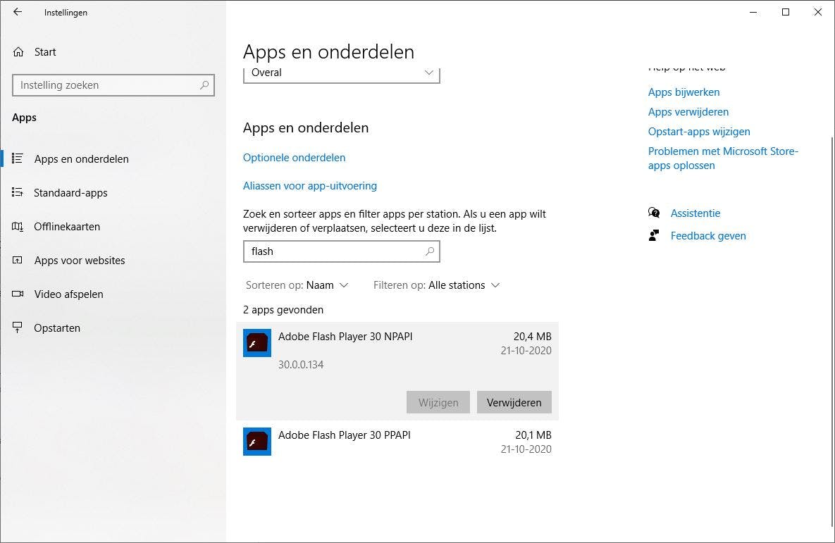 Wel is het zo dat de verwijderingstool alleen werkt wanneer Flash standaard al deel uitmaakte van jouw Windows 10-installatie. Dit is vaak het geval op apparaten waarop Windows 10 bij aankoop al geïnstalleerd is, zoals laptops waar wel meer bloatware op meelift. Heb je de Flash Player zelf geïnstalleerd, dan moet je deze ook zelf verwijderen. Dit kan via Instellingen, Apps.
