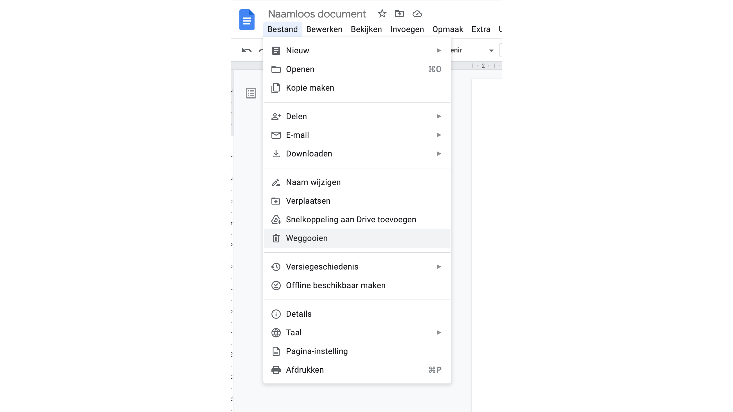 Toch kan het verwijderen een beetje verwarrend zijn door niet-consistente benamingen. Veronderstel dat je een geopend document in Google Doc wilt verwijderen, dan kun je hiervoor via het menu Bestand de optie Weggooien gebruiken.