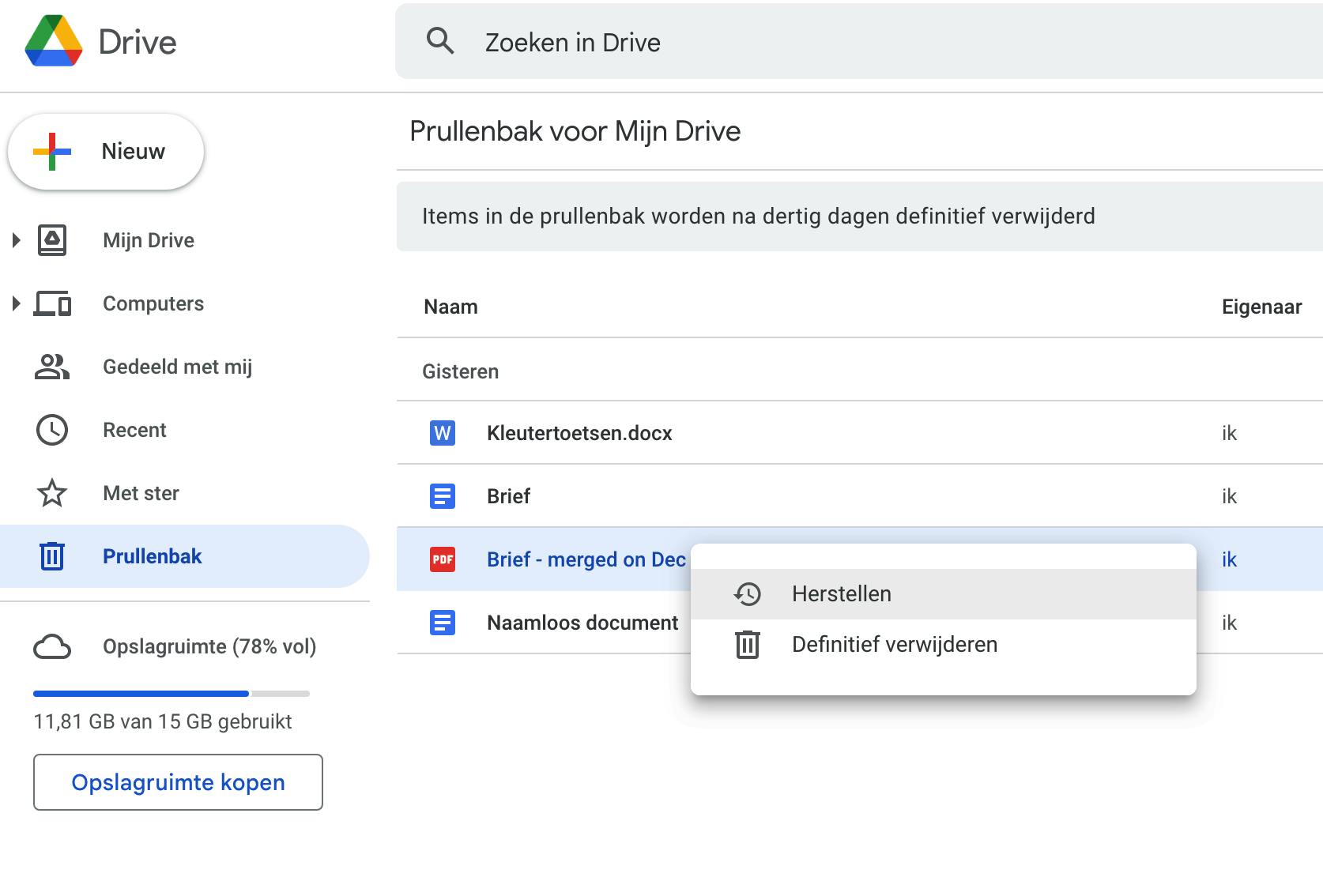 Hierdoor belandt het document in de prullenbak van Google Drive. Wanneer je de prullenbak in Drive opent, zie je daar alle bestanden die daar de afgelopen dertig dagen terecht zijn gekomen.