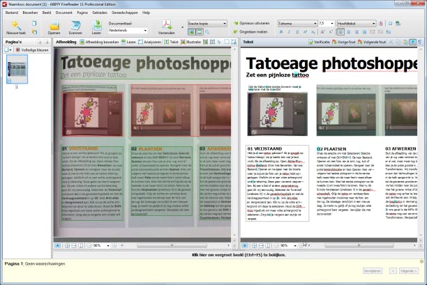 Alles overtypen? Nee. Wie papieren wil digitaliseren heeft een scanner en een speciaal softwarepakket met tekstherkenning (OCR) nodig. Al is die scanner tegenwoordig overbodig. ABBYY FineReader 11 Professional Edition maakt het mogelijk om foto's om te zetten naar bewerkbare bestanden in pdf- of Word-formaat. Het hoeft zelfs geen dure spiegelreflexcamera met 10 of meer megapixels te zijn. Een compactcamera of de camera van uw mobiele telefoon volstaat al. In het programma hoeft u enkel nog aan te geven naar welk formaat (Word, pdf, txt, csv etc) u het bestand wenst om te zetten. Tijdens onze test gebruiken we de camera van een iPhone 4. De resultaten waren indrukwekkend. Snapshots van artikelen uit verschillende tijdschriften werden nagenoeg foutloos omgezet naar een pdf-bestand, ongeacht het gebruikte lettertype. Letters waarover het programma niet honderd procent zeker is, worden blauw weergegeven en dat vergemakkelijkt het controleren. Toch is het met OCR-software raadzaam om gedigitaliseerde teksten altijd volledig na te lezen. Ook handig is de ingebakken taalherkenning en spellingschecker. Met de functie Lay-out analyseren kunt u foto's overnemen of overtollige witruimtes verwijderen. Uiteraard kunt u ook handmatig instellen welke paginadelen u al dan niet kwijt wilt.