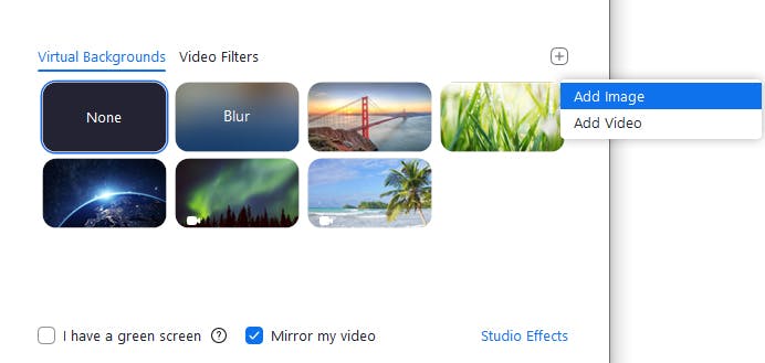 Blur zorgt ervoor dat je nog steeds je eigen achtergrond ziet, maar dan waziger. Verder zijn de standaard achtergronden vrij druk, vooral degenen die ook nog eens geanimeerd zijn zoals het Noorderlicht of het tropische eiland. Dat willen we liever niet, dus klik op het plus-icoontje om je eigen afbeelding te selecteren. Via Add image kies je het bestand vanaf je schijf.