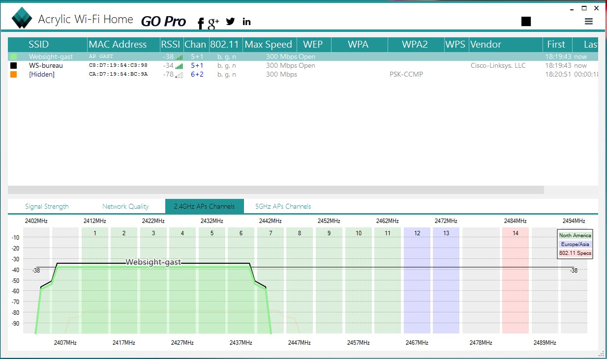 Nuttig om weten is dat een RSSI-waarde van bijvoorbeeld -40 beter is dan een waarde van -70 of hoger, waarbij het in de praktijk vaak zo is dat een waarde hoger dan -60 vaak een wankele verbinding betekent. Verder doe je er goed aan je router of toegangspunt (althans binnen de 2.4 GHz-band) op een kanaal in te stellen dat zover mogelijk is verwijderd van dat van je buren. Is dat bijvoorbeeld kanaal 6, stel dan zelf bij voorkeur kanaal 1 of 11 in.