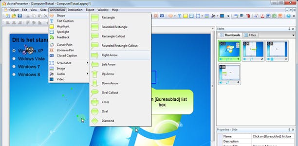 Na afloop beland je automatisch in het programmavenster van ActivePresenter en opnieuw is het even schrikken: dat blijkt behoorlijk veel opties en knopjes te hebben. Ruwweg is het venster in vier panelen verdeeld: een grote voorbeeldweergave van je opname, een miniatuuroverzicht van de verschillende slides (afzonderlijke opnames), een paneel met de (aanpasbare) eigenschappen van het door jou geselecteerde object (zoals de achtergrond, de muiscursor of een annotatie) en een heuse tijdlijn. De verschillende onderdelen van je opname (slide, cursorpad, tekst, annotatie) worden automatisch op deze tijdlijn uitgezet, maar deze timing kan je geheel naar eigen hand zetten. In tegenstelling tot vele andere screencast-tools laat ActivePresenter bovendien een zekere mate van interactie toe, bijvoorbeeld door een vraag toe te voegen. Er zijn zeven vraagtypes, waaronder True/False en Multiple Choice.