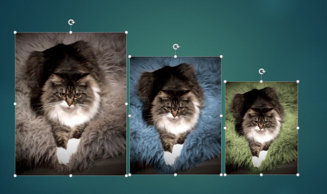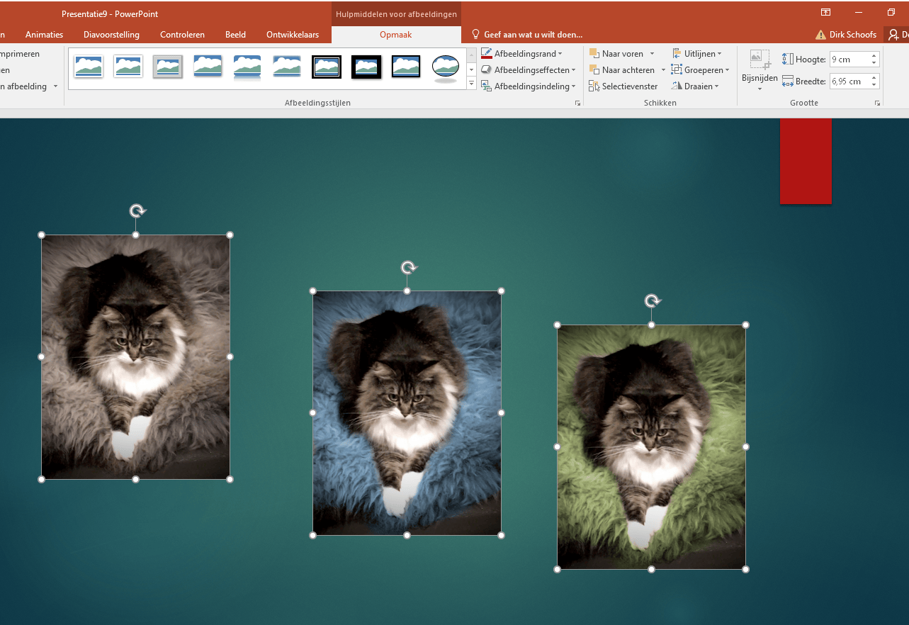 Veronderstel dat je drie afbeeldingen op een dia hebt geplaatst die allemaal een verschillende grootte hebben, dan kun je ze toch snel allemaal even groot maken. Eerst selecteer je alle afbeeldingen door de Ctrl-toets ingedrukt te houden en om de beurt op elke afbeelding te klikken. Omdat je afbeeldingen hebt geselecteerd verschijnt het tabblad Hulpmiddelen voor afbeeldingen / Opmaak. In de groep Grootte voer je de gewenste Hoogte en Breedte in voor alle afbeeldingen. Terwijl je typt in het vak Hoogte of Breedte krijgt het andere vak automatisch een waarde om de verhouding te behouden.