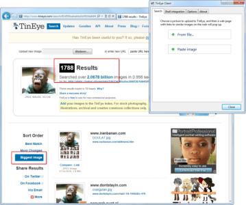 Ga naar TinEye en voeg de afbeelding die u zoekt toe bij Upload your image. TinEye zoekt visueel naar dezelfde afbeelding in een collectie van miljoenen foto's. De zoekresultaten verschijnen gesorteerd op Best match (grootste overeenkomst). Klik op Biggest image om de grootst mogelijke afbeelding als eerste te tonen. De resolutie en omvang van het fotobestand vindt u onder de afbeelding. Wie TinEye regelmatig gebruikt kan ook gebruikmaken van de TinEye Client. Dankzij dit hulpprogramma hoeft u de website niet te bezoeken om de afbeelding toe te voegen. TinEye Client draait op uw computer en maakt het versturen van foto's nog eenvoudiger.