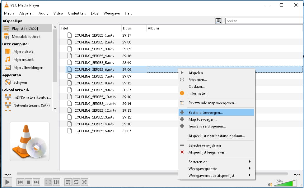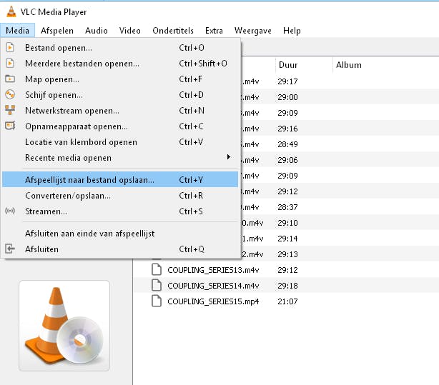 Bepaal nu de volgorde van de afspeellijst. In dit voorbeeld zijn de afleveringen genummerd, maar dat betekent niet dat je ze in die volgorde wilt bekijken. Klik op een bestand en sleep die naar boven of onderen om zelf een volgorde te bepalen. Nadat je alle video-of audiobestanden hebt toegevoegd en nadat je de afspeelvolgorde hebt gecontroleerd, ga je naar het menu Media en daar kies je de functie Afspeellijst opslaan in bestand. Je kunt eventueel ook de toetscombinatie Ctrl+Y gebruiken om de afspeellijst op te slaan.