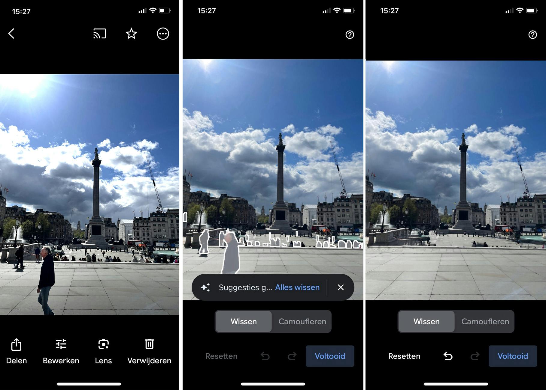 Als je in Google Foto’s eerst Bewerken selecteert en daarna Tools kiest, kom je bij de Magische gum. Vervolgens heb je twee opties Wissen of Camoufleren. Kies je Wissen, dan veeg je op de foto en Google Foto’s laat het voorwerp even oplichten voordat het verdwijnt. Met Camoufleren verandert de kleur van het object zodat dat beter in de achtergrond opgaat. Probeer Trafalgar Square in Londen maar eens te fotograferen zonder toeristen. De magische gum stelt zelf voor om iedereen te verwijderen en een seconde later heb je een unieke foto.