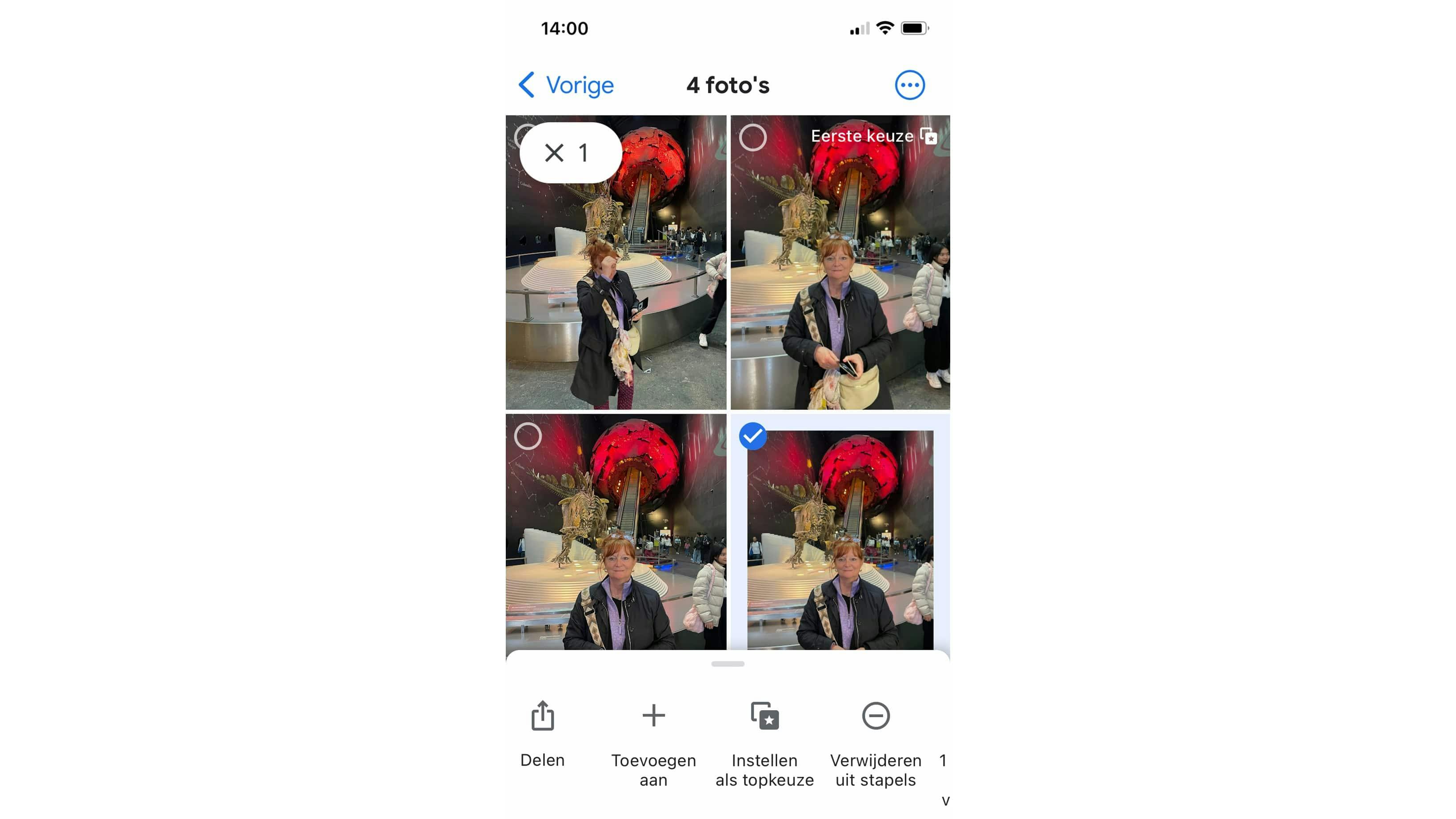 Vermoedelijk is deze functie al actief bij jou. Is dat niet het geval, dan moet je de functie Fotostapels nog inschakelen in de app. Hiervoor tik je op het profielpictogram rechtsboven en activeer je de Instellingen voor Google Foto’s. Daar open je de Voorkeuren en dan kun je de optie Vergelijkbare foto’s stapelen aanzetten. Vervolgens kun je door de galerij bladeren. Je herkent zo’n stapel ook aan het dubbele vierkante pictogram, een ministapeltje. De miniatuur die bovenaan ligt, is de zogenaamde Eerste keuze. Als je bijvoorbeeld de tweede foto bovenaan wilt plaatsen, dan selecteer je die en vervolgens tik op je de drie puntjes in de rechterbovenhoek. Op die manier kun je de opdracht Instellen als topkeuze gebruiken. Via dit menu kun je ook foto’s uit de stapel verwijderen. Tot slot is er de optie Deze bewaren en de rest verwijderen om alleen de beste foto van de stapel over te houden.