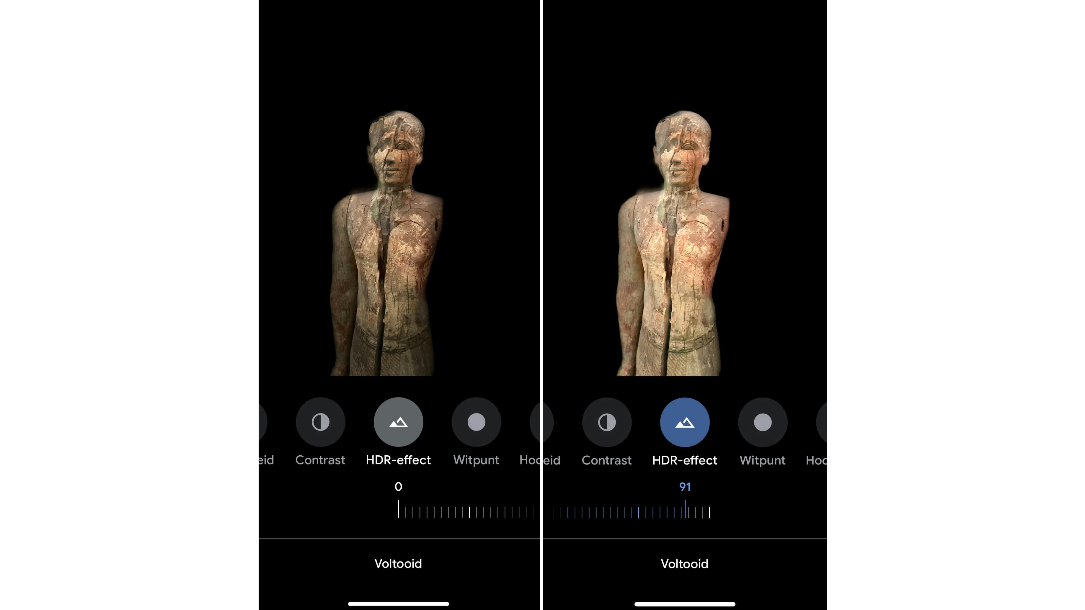Via de opdrachten Bewerken / Aanpassen kun je de functie HDR aanspreken. High Dynamic Range zorg dat de weergave van de details in de foto dichter in de buurt komen bij wat het menselijk oog in de echte wereld kan waarnemen. Meestal gaat het om meer details die je in de donkerste en in de helderste delen van de foto kunt zien. Met de HDR-functie worden de donkere delen zo gecorrigeerd dat ze iets duidelijker worden. Je kunt het HDR-effect zelfs in video’s gebruiken.