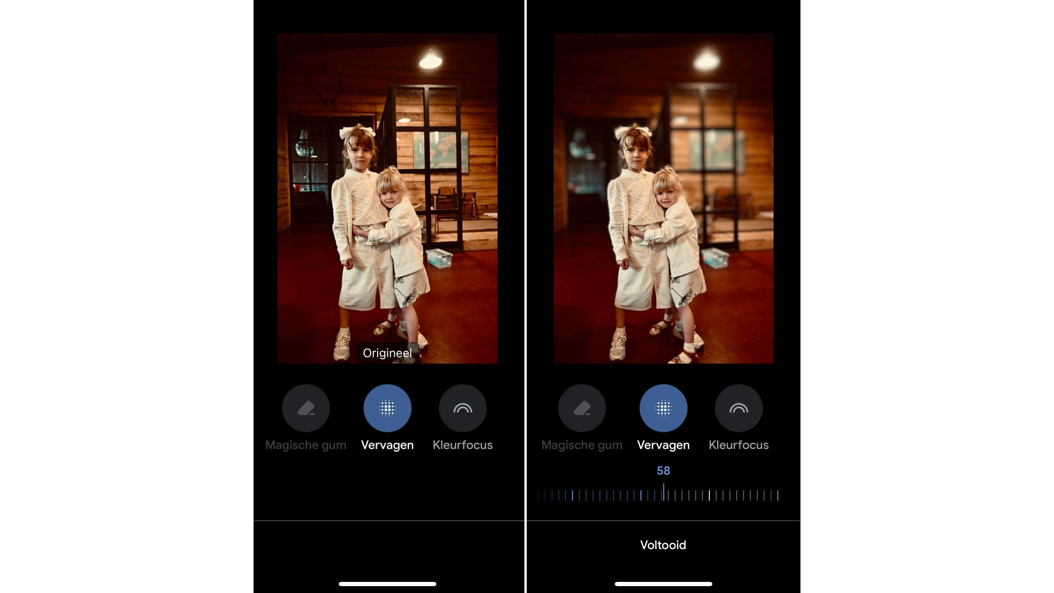 Google Foto’s heeft ook een slimme fotobewerkingsfunctie om de achtergrond van een foto te vervagen. De tool is zo slim dat je niet eens hoeft aan te duiden wat voor- en achtergrond is. Open de foto en ga naar Bewerken / Tools en kies daar Vervagen. Aan de hand van een slider bepaal je de intensiteit van de vervaging. Om het resultaat snel te vergelijken met de oorspronkelijke afbeelding houd je je vinger ingedrukt op de foto. Ben je tevreden? Tik dan op Voltooid en pas de foto eventueel verder aan met andere tools. Je kunt het beeld ook direct Opslaan.