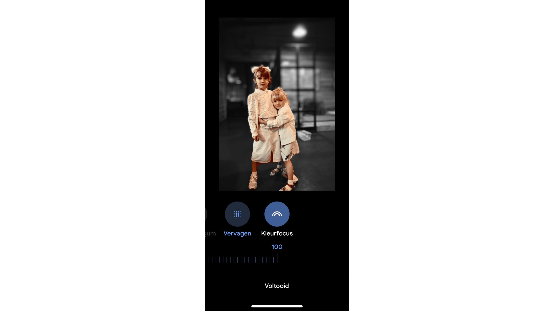 Met Vervagen experimenteer je met de scherptediepte. Met de optie Kleurfocus gebruik je de kleurinformatie uit de foto. Wat beide functies gemeen hebben, is dat Google Foto’s zelf weet wat er moet worden geaccentueerd en dat het de voorgrond nog meer benadrukt. De tool Kleurfocus staat daarom terecht naast de knop Vervagen.