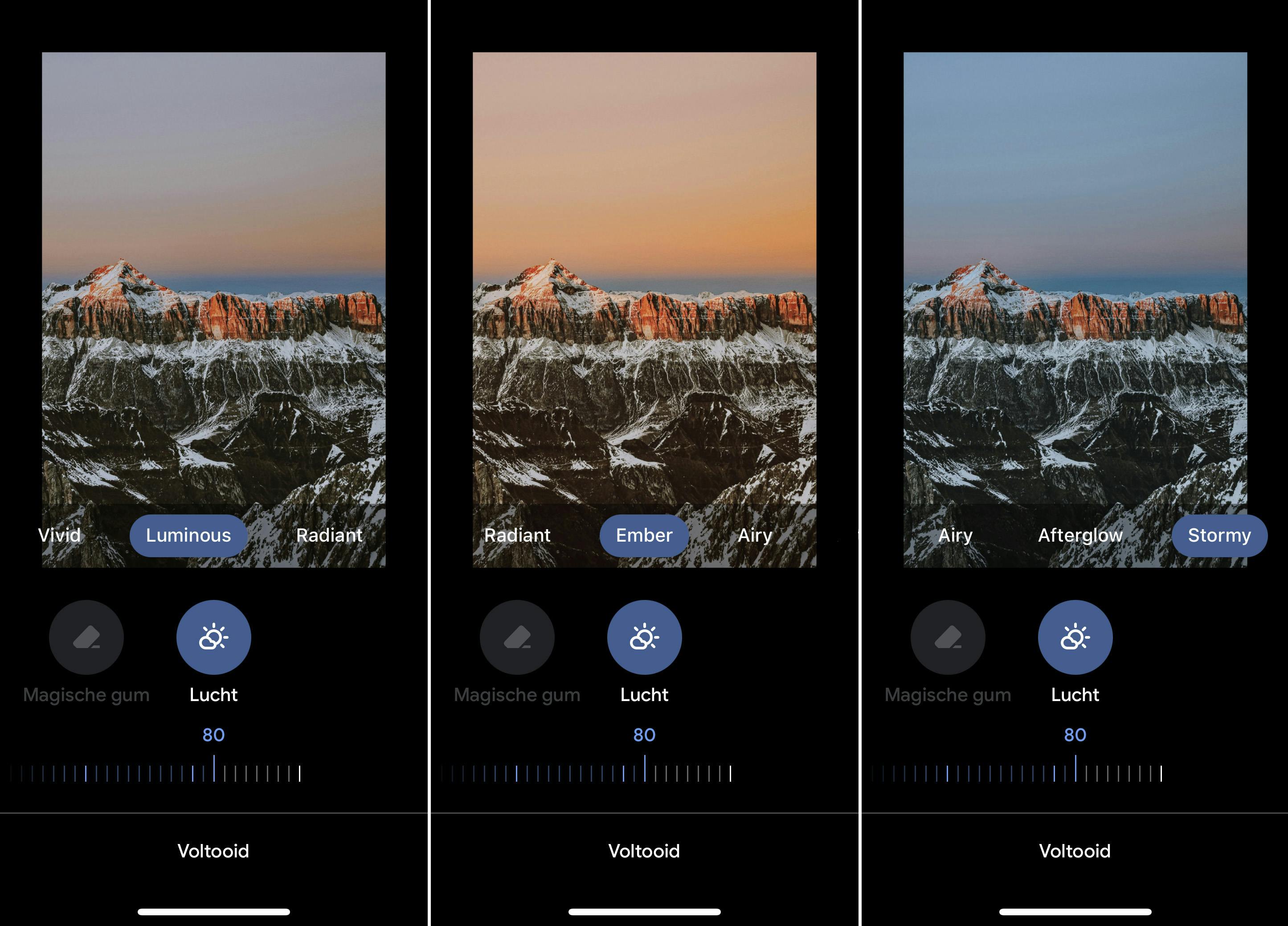 Via Bewerken / Tools kom je ook bij de opdracht Lucht. Hier kies je een van de verschillende mooie luchteffecten, onder meer Vivid, Afterglow en Stormy. Daaronder bepaal je de intensiteit van de aanpassing. Weer hoef je niets te doen om de finesse en de overgang tussen lucht en voorgrond te selecteren, dat doet de AI. Welke lucht je ook kiest, het landschap blijf onaangeroerd.