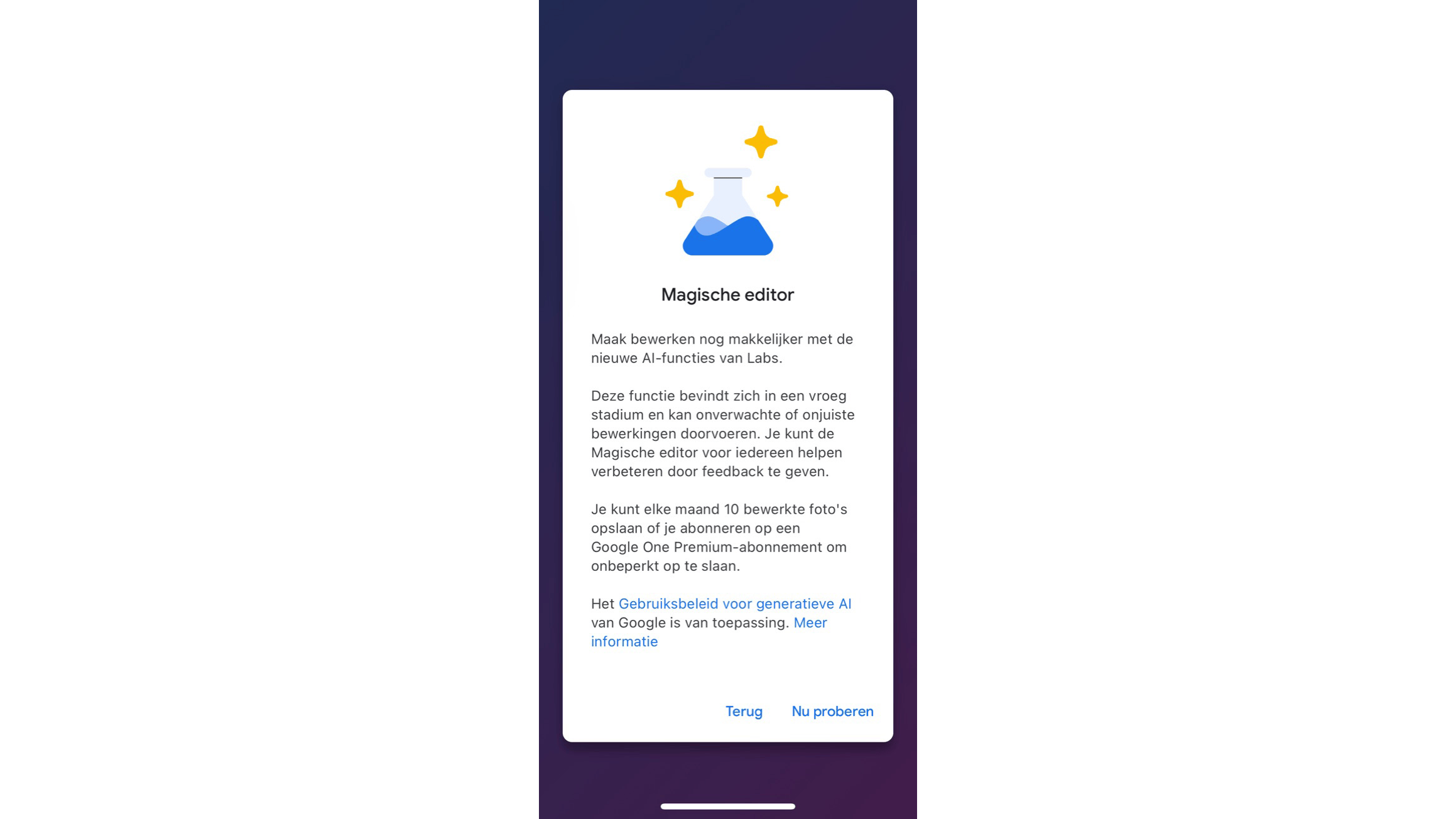 De eerste keer dat je deze functie opent, krijg je een boodschap dat deze functie zich nog in een vroeg stadium bevindt en dat je de editor met je feedback kunt helpen verbeteren. Je kunt elke maand tien foto’s opslaan die je met deze speciale editor hebt bewerkt, of je kunt een Google One Premium-abonnement nemen.