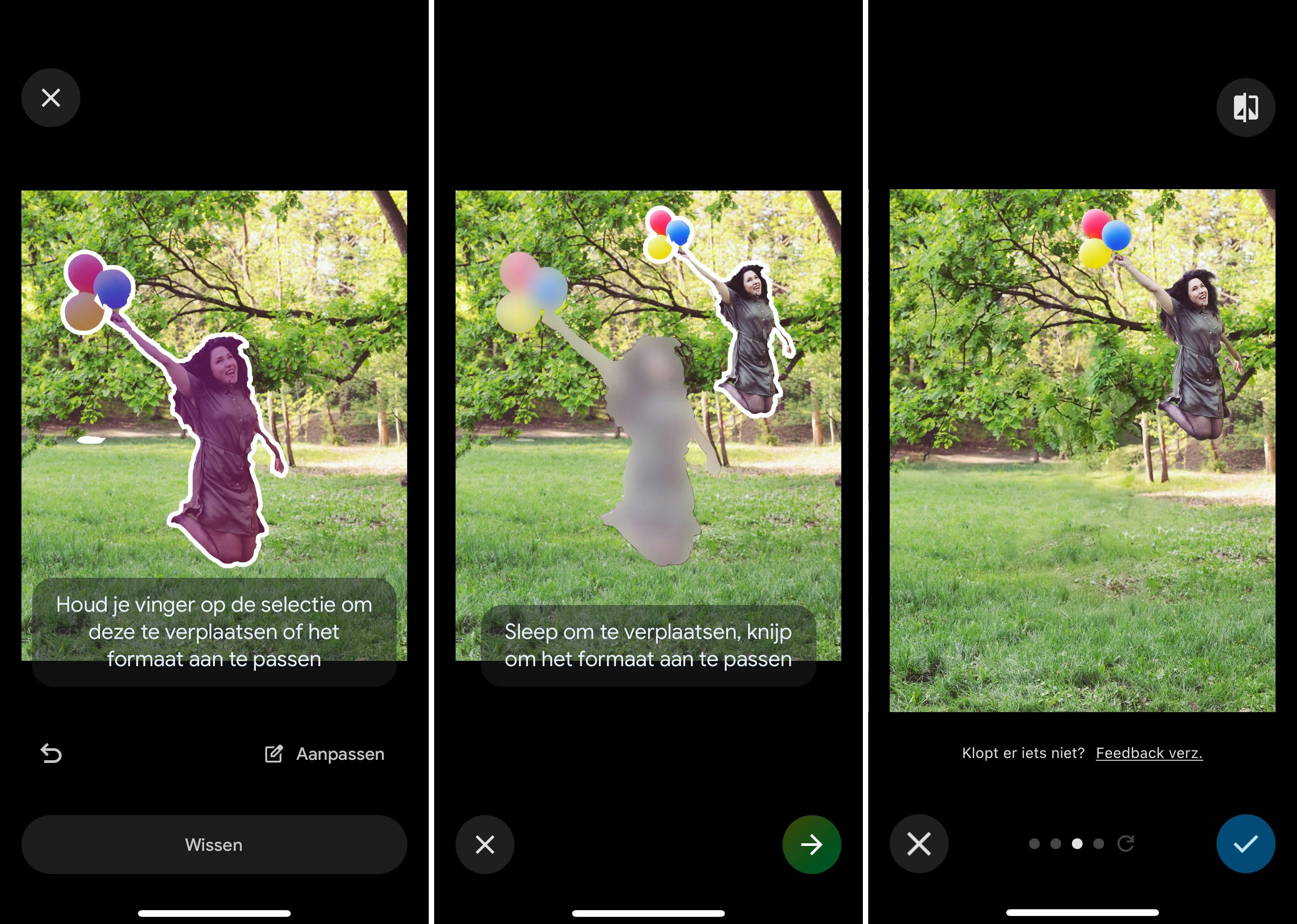 Met de magische editor is het mogelijk om een object weg te toveren of te verplaatsen. We tonen dit aan de hand van de vrouw met ballonnen die een sprong maakt. Eerst duid je aan wat je precies wilt verplaatsen. De AI maakt meteen een nauwkeurige selectie. Als er een stukje mist, dan kun je dat toevoegen aan de selectie door ook dat stukje aan te stippen. Vervolgens houd je je vinger op de selectie om deze te verplaatsen of om het formaat aan te passen.