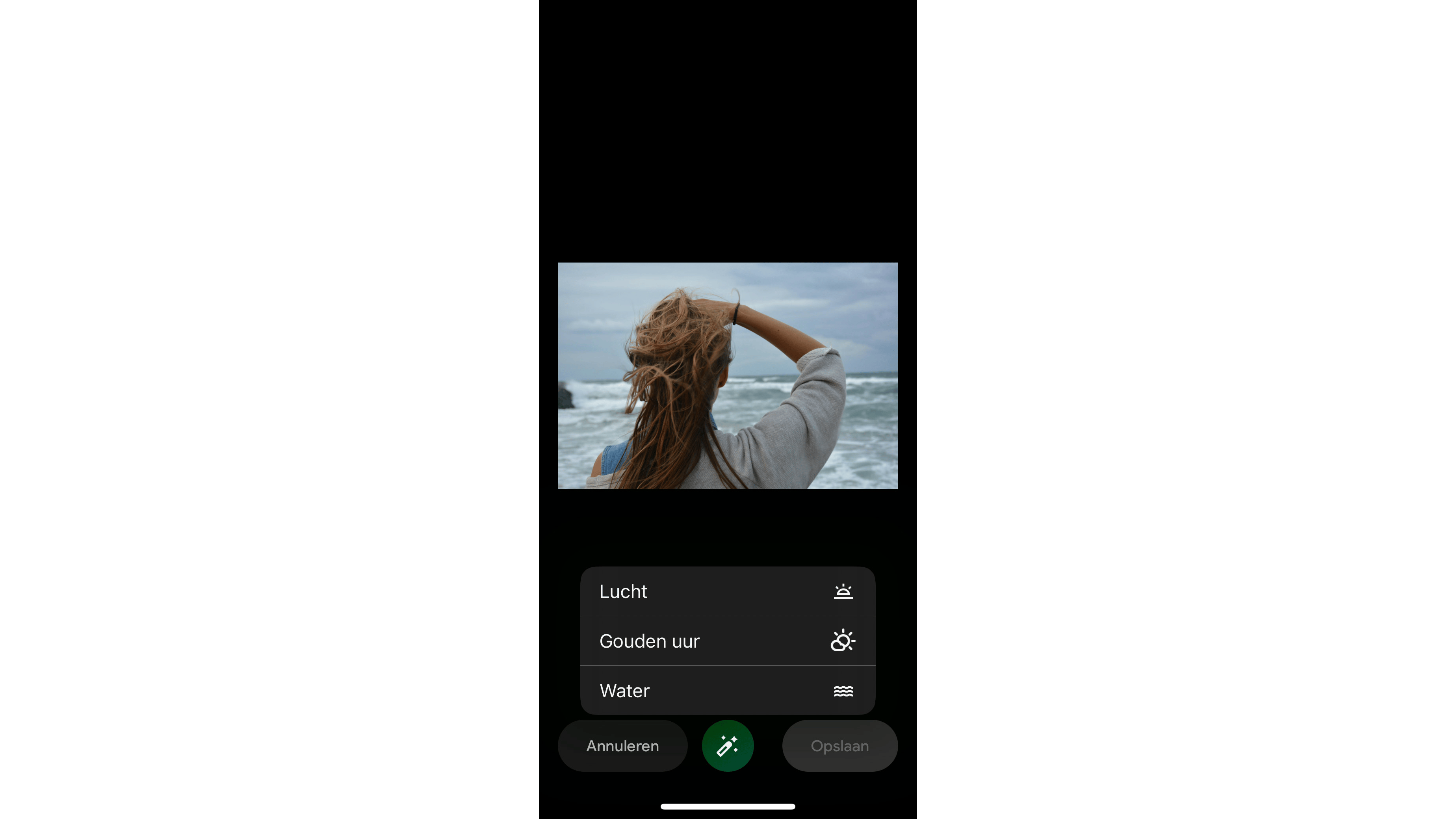 Wanneer je een foto bewerkt met de magische editor kun je via het toverstafje ook bijzondere variaties en effecten toepassen die afgestemd zijn op het type foto dat je opent. In dit zeezicht kun je bijvoorbeeld de lucht een ander karakter geven of je kunt het gouden uur toepassen. Dat is het laatste uur voor zonsondergang en eerste uur na zonsopgang. Dit moment is het favoriete moment voor professionele fotografen, omdat dit het perfecte licht is om fantastische foto’s te schieten.