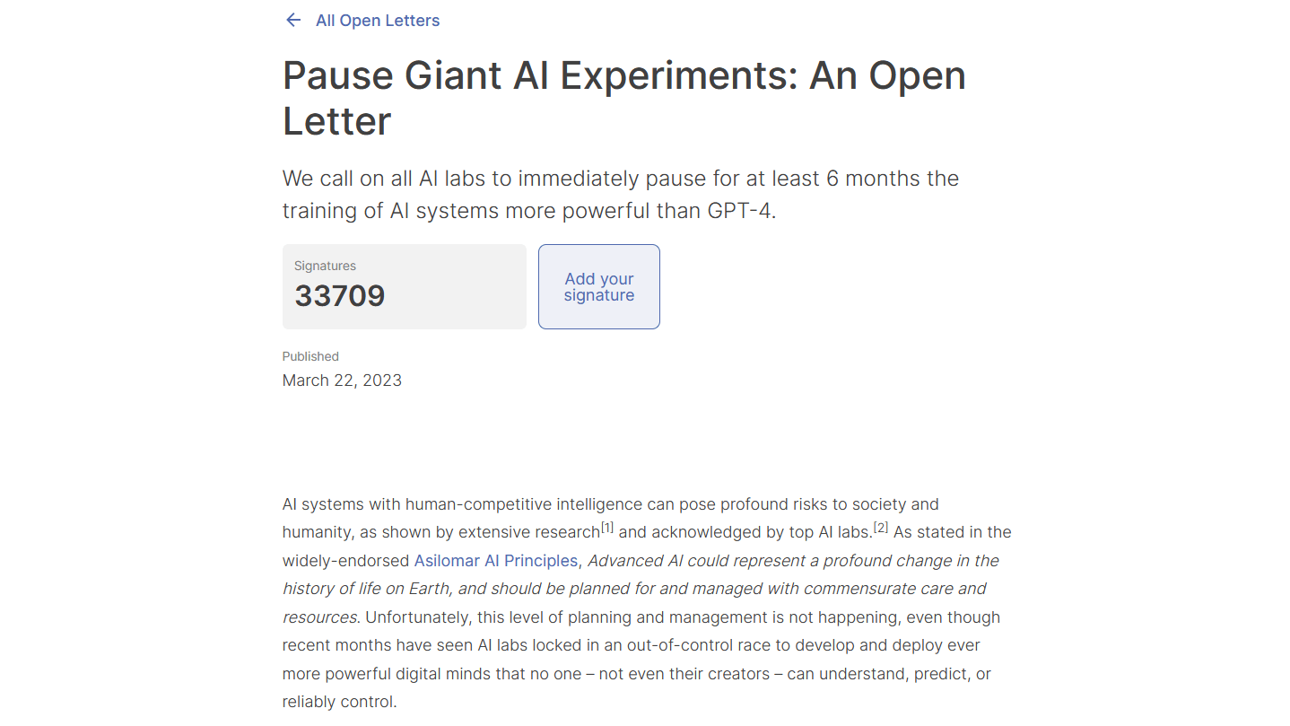 Een grote groep tech-prominenten schreef begin 2023 een open brief, waarin ze ervoor pleiten om de ontwikkeling van kunstmatige intelligentie te pauzeren. ‘Wacht een half jaar met het bouwen van AI-systemen die krachtiger zijn dan GPT-4’, luidde de boodschap.