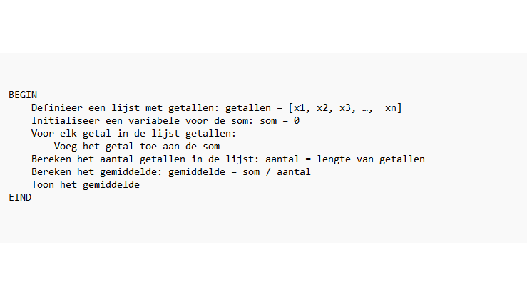 In de afgelopen jaren hebben computerprogramma’s veel processen geautomatiseerd. Deze programma’s waren gebaseerd op regels (rule based), en hadden dus een logische opbouw. De mens leverde de regels en de input, en het programma deed de rest. Zelfs als je niet kunt programmeren, kun je voor eenvoudige taken de regels zelf wel bedenken. Neem bijvoorbeeld pseudocode (een beschrijving van de logica van een algoritme, zonder de strikte syntax van een programmeertaal) voor het berekenen van een gemiddelde. Deze kan er als volgt uitzien: