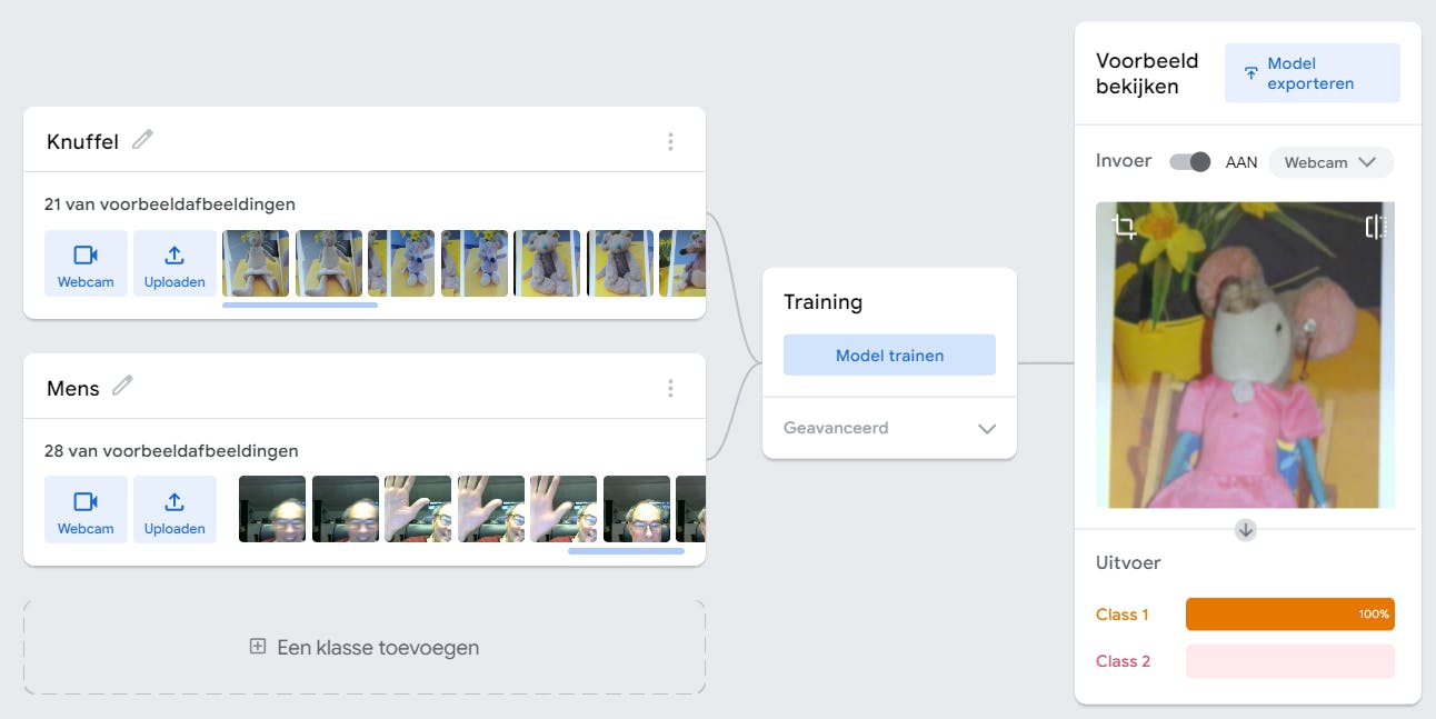 Training Je kunt zelf een AI-netwerk trainen zonder je te verdiepen in het ontwerp en de verbindingen van het netwerk. Een gebruiksvriendelijke tool hiervoor is Teachable Machine. Deze tool stelt je in staat om zonder programmeerkennis snel machinelearning-modellen te maken voor websites of apps Je kunt modellen trainen met eigen afbeeldingen, bijvoorbeeld van je webcam, of met audio. Het resultaat is een AI-tool die de gewenste patronen kan herkennen. Deze tool kan gecombineerd worden met een microcontroller, zoals Raspberry Pi of Arduino voor automatiseringsprojecten.