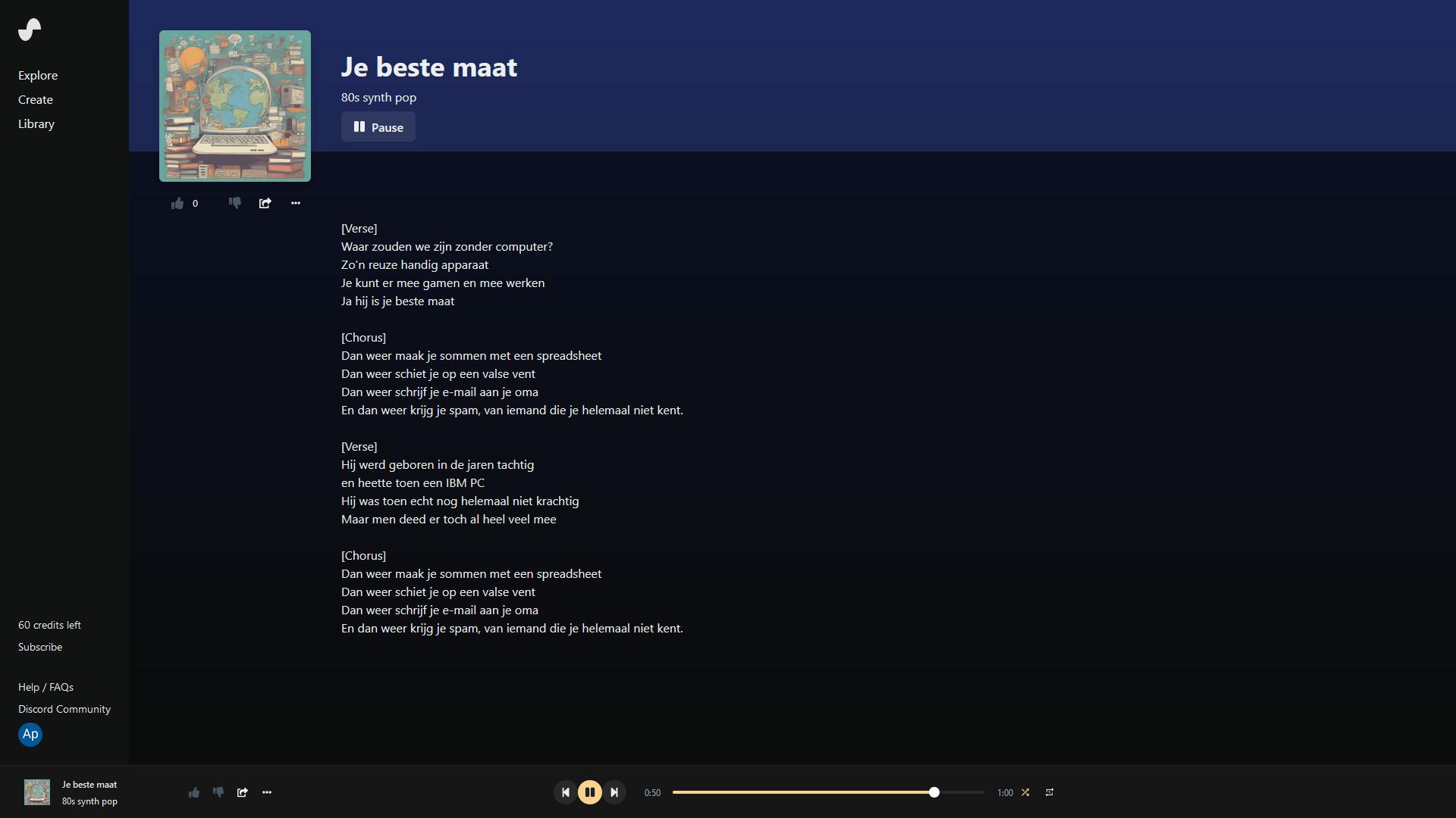 Waar de eerder genoemde tools zich (voornamelijk) richten op instrumentale muziek, is Suno AI een echte liedjesbakker. Via een prompt geef je om te beginnen aan wat voor soort nummer je wilt maken. Een voorbeeld: a cheerful uptempo tune with the feel of summer about a man walking on the beach. Vervolgens krijg je binnen een minuut twee varianten van (het begin van) een nummer dat aan die omschrijving voldoet. Daarbij maakt het systeem zelf een Engelse tekst over het gevraagde onderwerp. De muziek kun je, compleet met zang, downloaden. Je kunt Suno AI ook vragen om meer muziek toe te voegen, al zijn we van die functie nog niet echt onder de indruk.