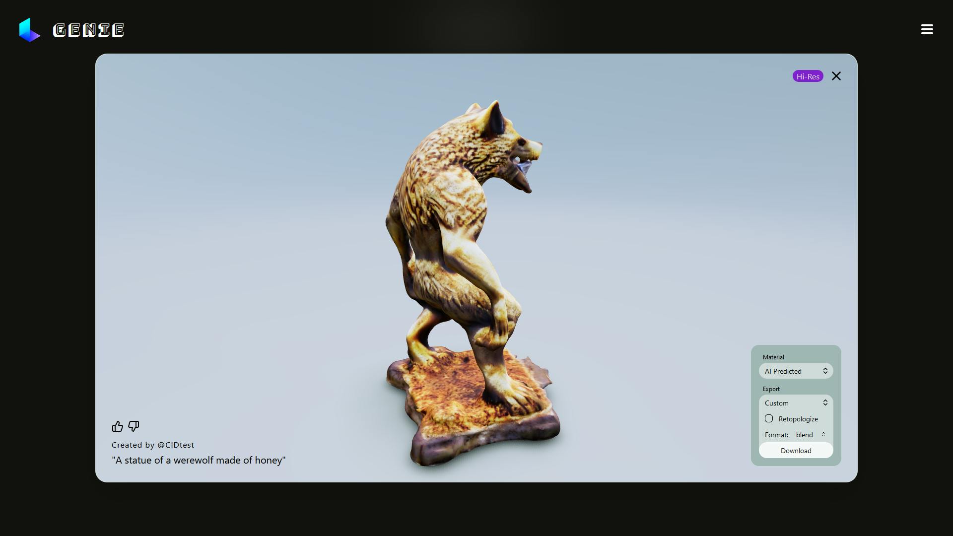 Luma AI bestaat uit twee onderdelen. Het eerste heet Genie en kun je omschrijven als text-to-3d. Door het ingeven van een prompt, zoals A statue of a werewolf made of honey, kan de webtoepassing een heus 3D-object voor je maken. Dat kun je vervolgens van alle kanten bekijken.