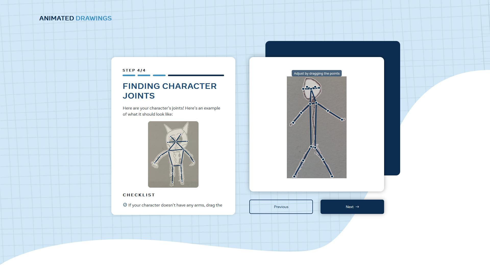 Je begint met het uploaden van een foto van de tekening. Daarna identificeert de AI zelf het figuurtje. Er wordt onder meer vastgesteld waar de gewrichten voor de armen en benen zitten. Maakt de AI een fout, dan kun je die handmatig corrigeren. Daarna kan de AI tientallen animaties voor je maken met het figuurtje in de hoofdrol. Deze kun je downloaden als video of delen via mail of sociale media.