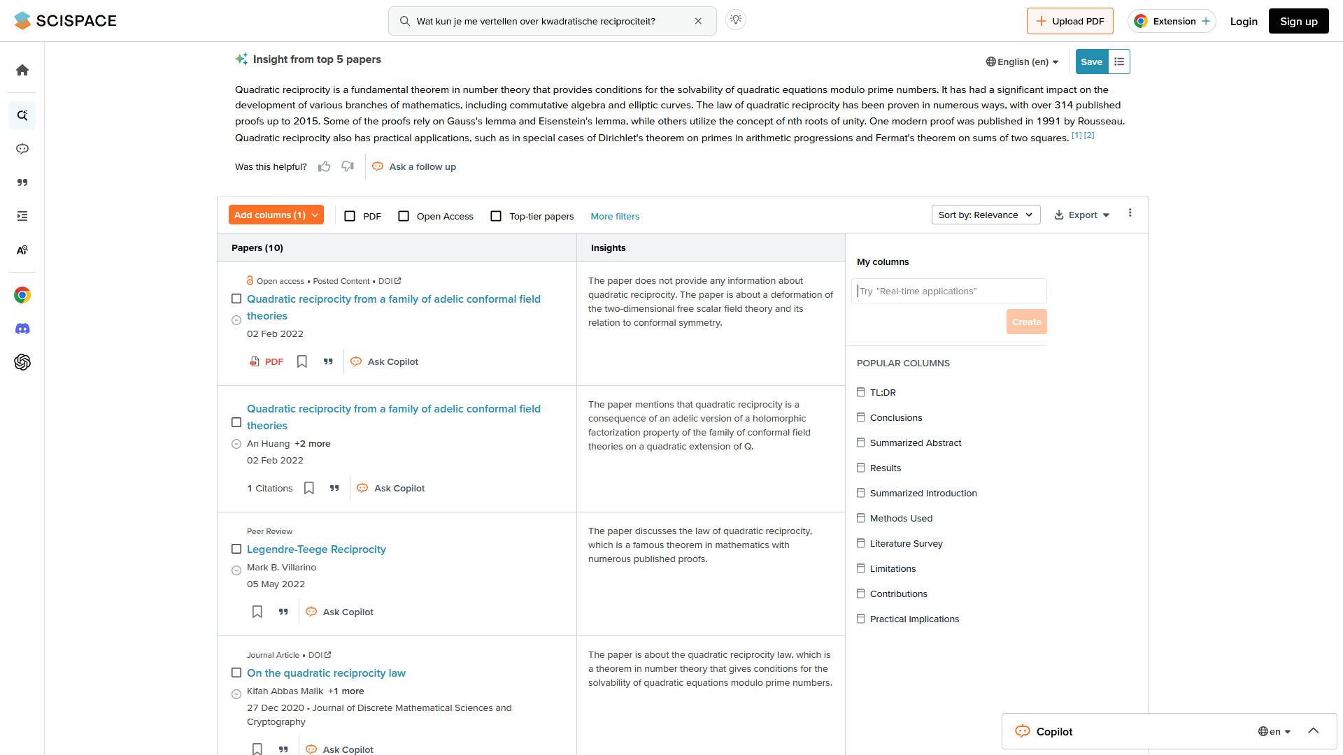 Waar Perplexity een vraagbaak is voor algemene onderwerpen, is SciSpace dat specifiek voor wetenschappelijke kennis. Hier kun je vragen stellen over wetenschappelijke onderwerpen, ook in het Nederlands. Vervolgens citeert SciSpace toonaangevende bronnen over dat onderwerp in de vorm van Engelstalige wetenschappelijke publicaties. Als je dat zware kost vindt, kan SciSpace je ook helpen. Je kunt er namelijk pdf-bestanden (tot 100 MB) uploaden en vervolgens vragen stellen over de inhoud daarvan.