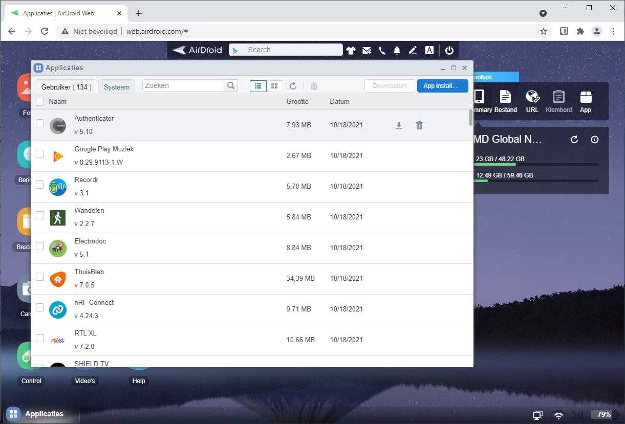 Voor uitgebreider beheer ga je naar Bestanden, waar je via een soort bestandsbeheerder door alle bestanden kunt bladeren. Naast de bekende beheerfeatures als knippen en plakken, kun je ook bestanden of mappen uploaden vanaf je pc naar je smartphone. Ook nuttig is Apps, waar je door alle geïnstalleerde apps kunt bladeren. Je kunt hier bijvoorbeeld de installatiebestanden in het bekende apk-formaat downloaden, maar ook via het prullenbakicoontje snel bepaalde apps verwijderen.