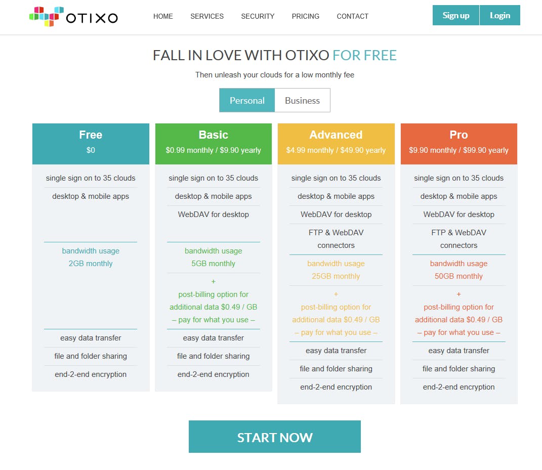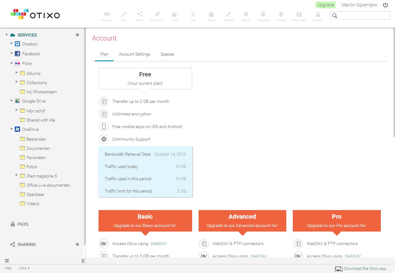 Het goede nieuws is dat Otixo gratis is, althans, als je gebruikmaakt van de basisfunctionaliteiten van de dienst. Bij dit basis-abonnement kun je maar liefst 35 cloud-accounts aan je Otixo-account koppelen en hoewel dat heel veel lijkt (en ook is), is de limiet aan dataverkeer op 2 GB gesteld. En dat is niet zo veel. Voor 1 dollar per maand (ca. 0,90 euro) krijg je 5 GB, voor 5 dollar per maand (ca. 4,50 euro) 25 GB en voor 10 dollar per maand (ca. 9 euro) krijg je 25 GB. Je kunt op elk gewenst moment overstappen van een gratis account naar een betaald account. Lees ook: De beste clouddiensten voor de meeste gratis opslag.