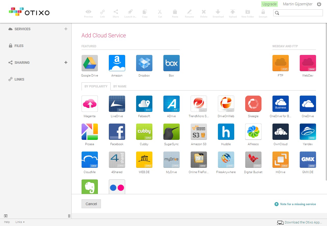 Wanneer je een account gekoppeld hebt, zie je de inhoud daarvan direct in Otixo. Maar aan één account koppelen heb je natuurlijk niet zo heel veel, dan kun je net zo goed inloggen bij de dienst zelf. Om nog een account te koppelen klik je in het linkerdeelvenster op het plusteken bij het kopje Services. Je komt nu wederom in het menu terecht met alle mogelijke clouddiensten waaruit je kunt kiezen. Herhaal deze stap net zo vaak tot je alle clouddiensten die je wilt koppelen aan je Otixo-account hebt toegevoegd.