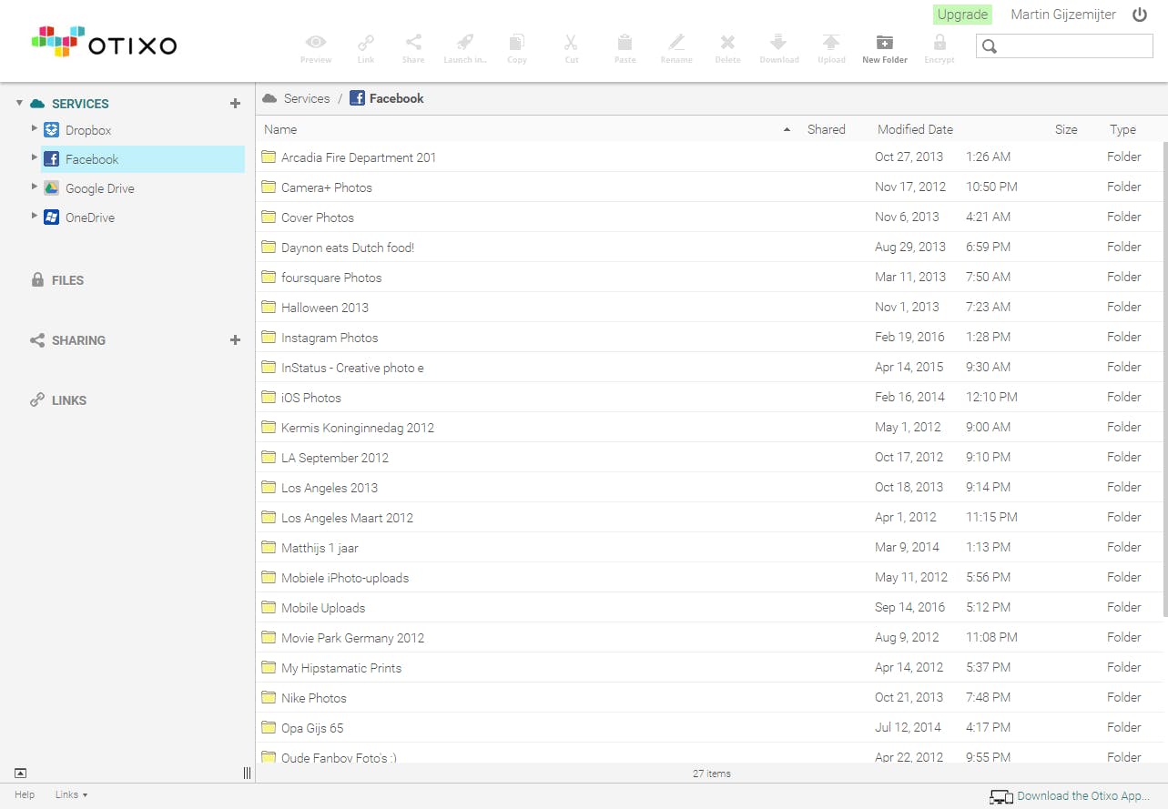Even een speciale vermelding met betrekking tot de ‘clouddiensten’ die je kunt koppelen voor Facebook. Het is natuurlijk een beetje vreemd dat Facebook daartussen staat, omdat het een sociaal netwerk is en geen opslagdienst voor bestanden. Maar als je Facebook actief gebruikt, staan er waarschijnlijk gigantisch veel foto’s van je op de Facebook-servers. En weet je wat nu het geweldige is? Met Otixo kun je die foto’s gewoon bekijken via een mappenstructuur, iets dat zelfs bij Facebook zelf niet mogelijk is. Downloaden kan ook, maar denk aan je datalimiet. Een ideale kans om grote schoonmaak te houden op Facebook.