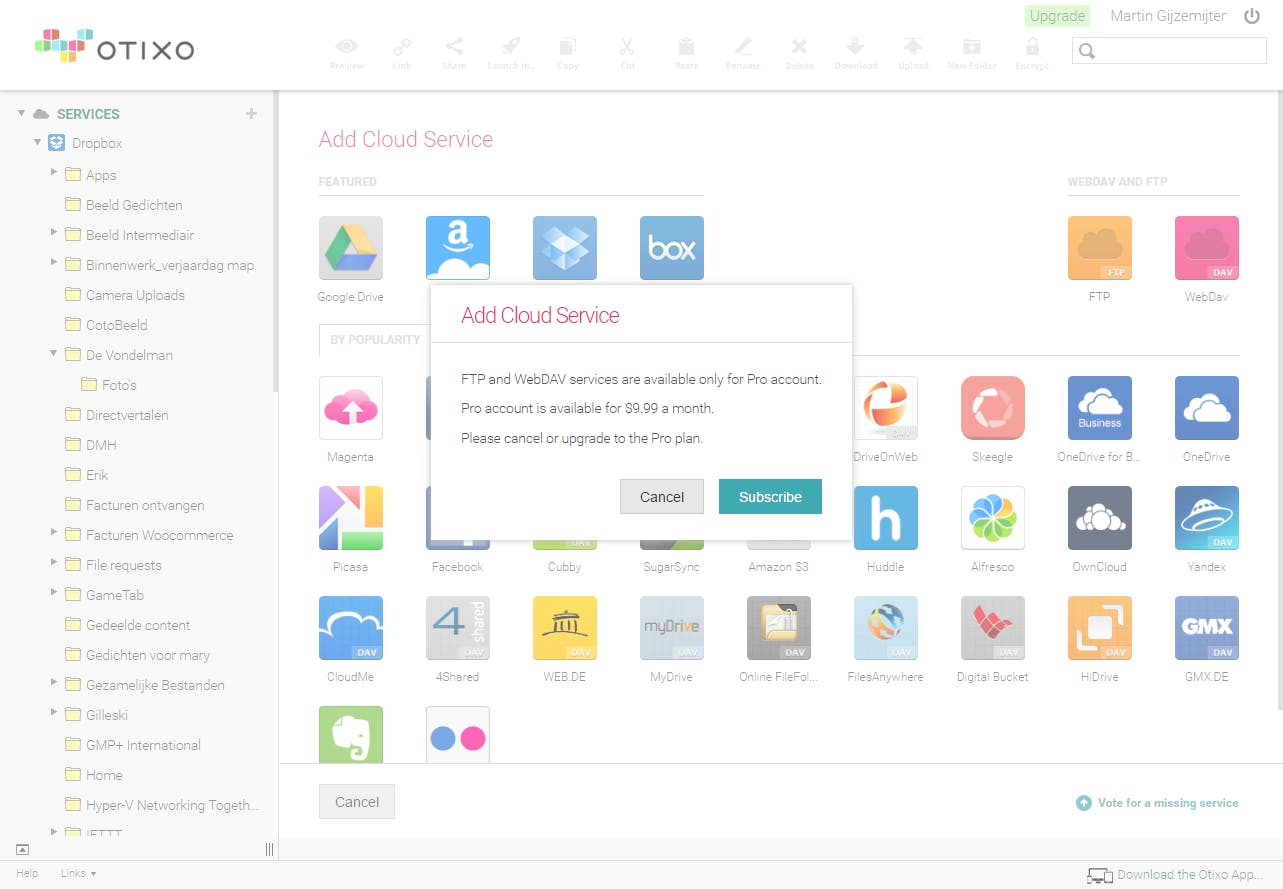 Bij het toevoegen van accounts zie je rechtsboven twee opties staan: FTP en WebDav. Dit zijn weliswaar geen clouddiensten, maar hiermee kun je rechtstreeks verbinding maken met een webserver, bijvoorbeeld de server waar je eigen website op draait. Handig, want dan kun je dus via Otixo bestanden rechtstreeks vanuit de cloud naar je webserver kopiëren. Het nadeel? Deze functionaliteit gaat het basisverbruik voorbij, dus hier zul je een betaald account voor moeten nemen, helaas zelfs het Pro-account van bijna 10 dollar per maand.