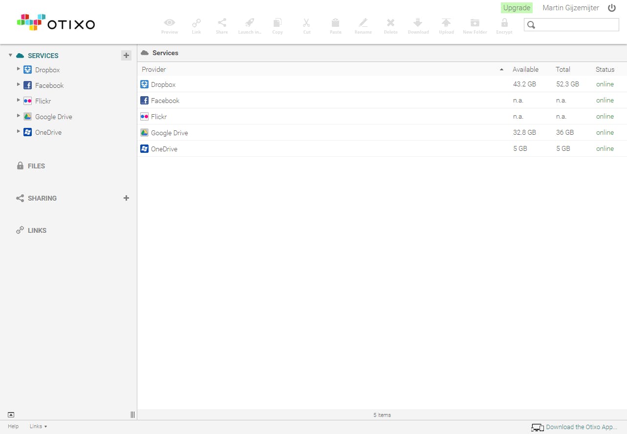Als we je vragen hoeveel ruimte je nog vrij hebt op je Dropbox- of OneDrive-account, kun je ons dat waarschijnlijk niet uit je hoofd vertellen. Inzicht hierin hebben is handig, want je zult altijd zien dat je zonder ruimte komt te zitten op het moment dat je ergens enorm veel haast mee hebt (en dan in de stress dingen weg gaat gooien die je beter had kunnen bewaren). Een van de handige dingen aan al je accounts verzamelen in Otixo, is dat je in één overzicht kunt zien waar je ruimtegebrek hebt. Klik hiervoor linksboven op het kopje Services. Je krijgt dan al je diensten te zien, met daarbij de totale opslagruimte en de resterende ruimte.
