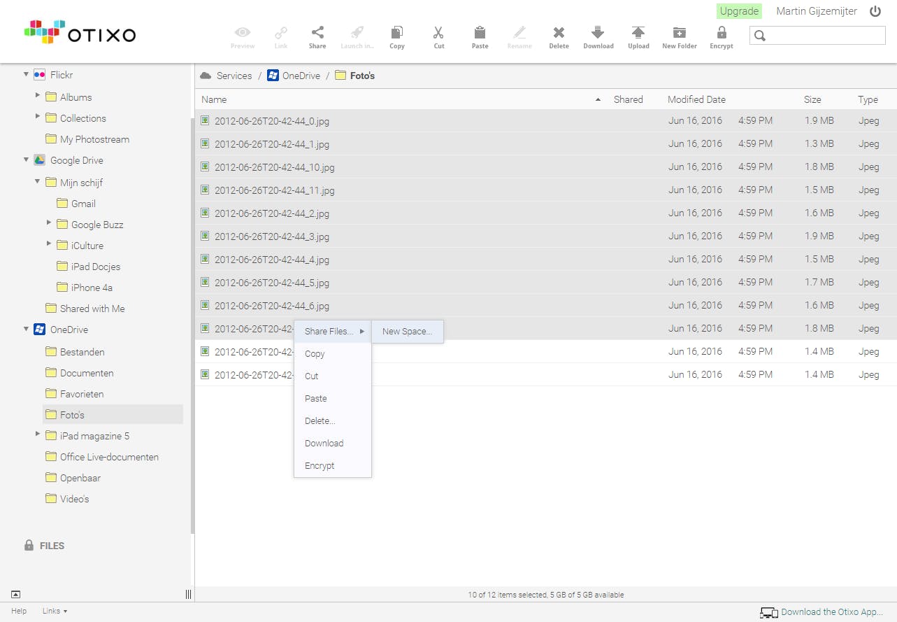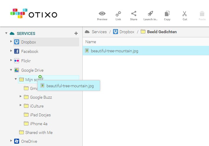 In een ideale wereld heb je al je clouddiensten tot in de puntjes georganiseerd. In de werkelijkheid is het waarschijnlijk een puinzooi. Met Otixo kun je heel eenvoudig orde in de chaos scheppen door bestanden tussen de verschillende diensten te verslepen. Zo kun je bijvoorbeeld besluiten om een dienst te gebruiken voor je afbeeldingen, de andere voor documenten, weer een andere voor video’s enzovoort. Je kunt bestanden heel eenvoudig kopiëren tussen diensten door ernaar te navigeren, de muisknop op het bestand (of de selectie van bestanden) van je keuze ingedrukt te houden en je selectie te verslepen naar de clouddienst waar je het naartoe wilt kopiëren. Door de muis boven een map te houden, vouwt deze map automatisch uit.